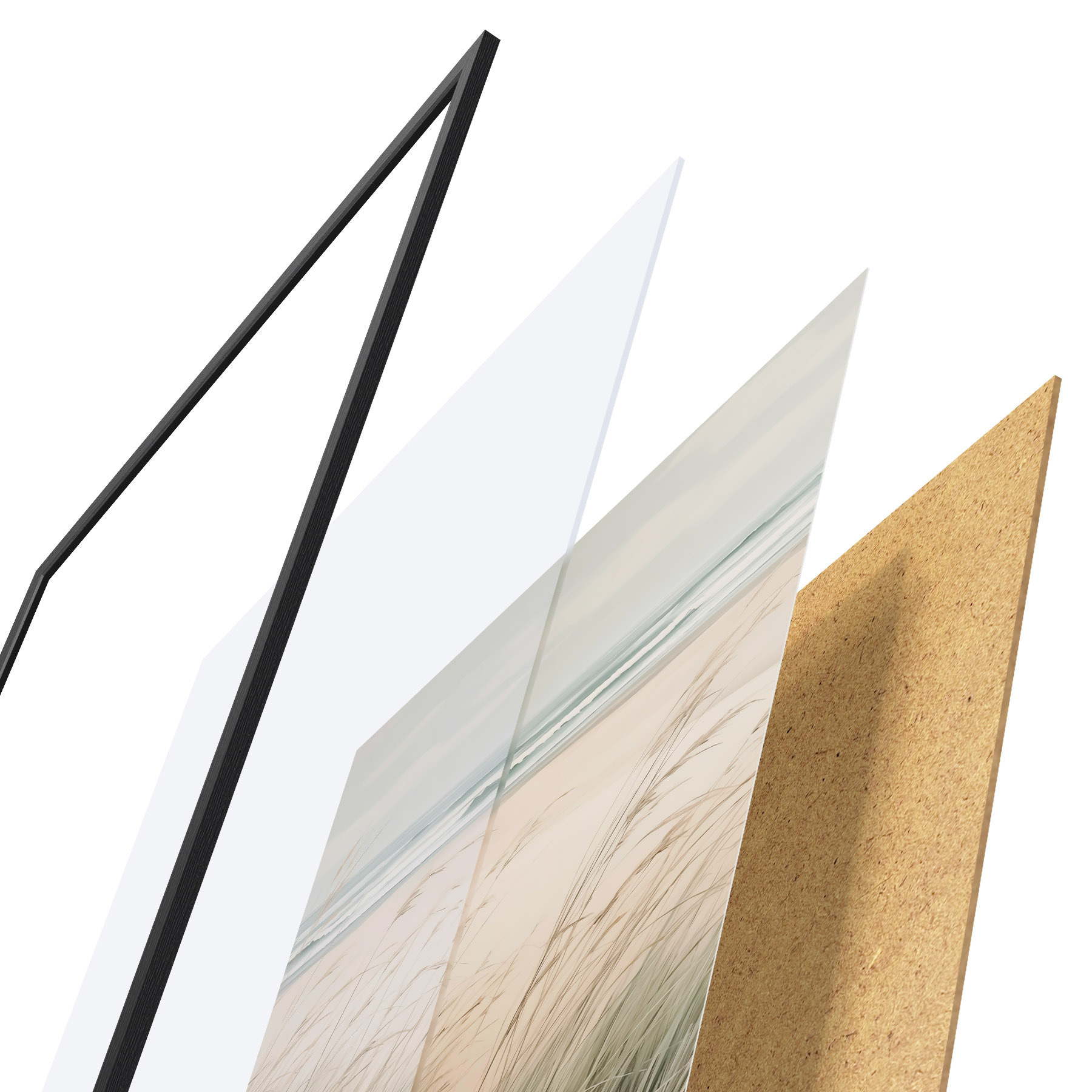 Plakatą sudaro rėmas, pleksiklas, atspausdintas vaizdas ir medžio drožlių plokštės pagrindas. Plakatą galima iš karto pakabinti ant sienos dėl kitoje pusėje esančių laikiklių.