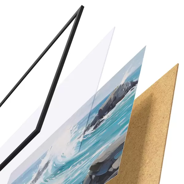 Plakatą sudaro rėmas, pleksiklas, atspausdintas vaizdas ir medžio drožlių plokštės pagrindas. Plakatą galima iš karto pakabinti ant sienos dėl kitoje pusėje esančių laikiklių.