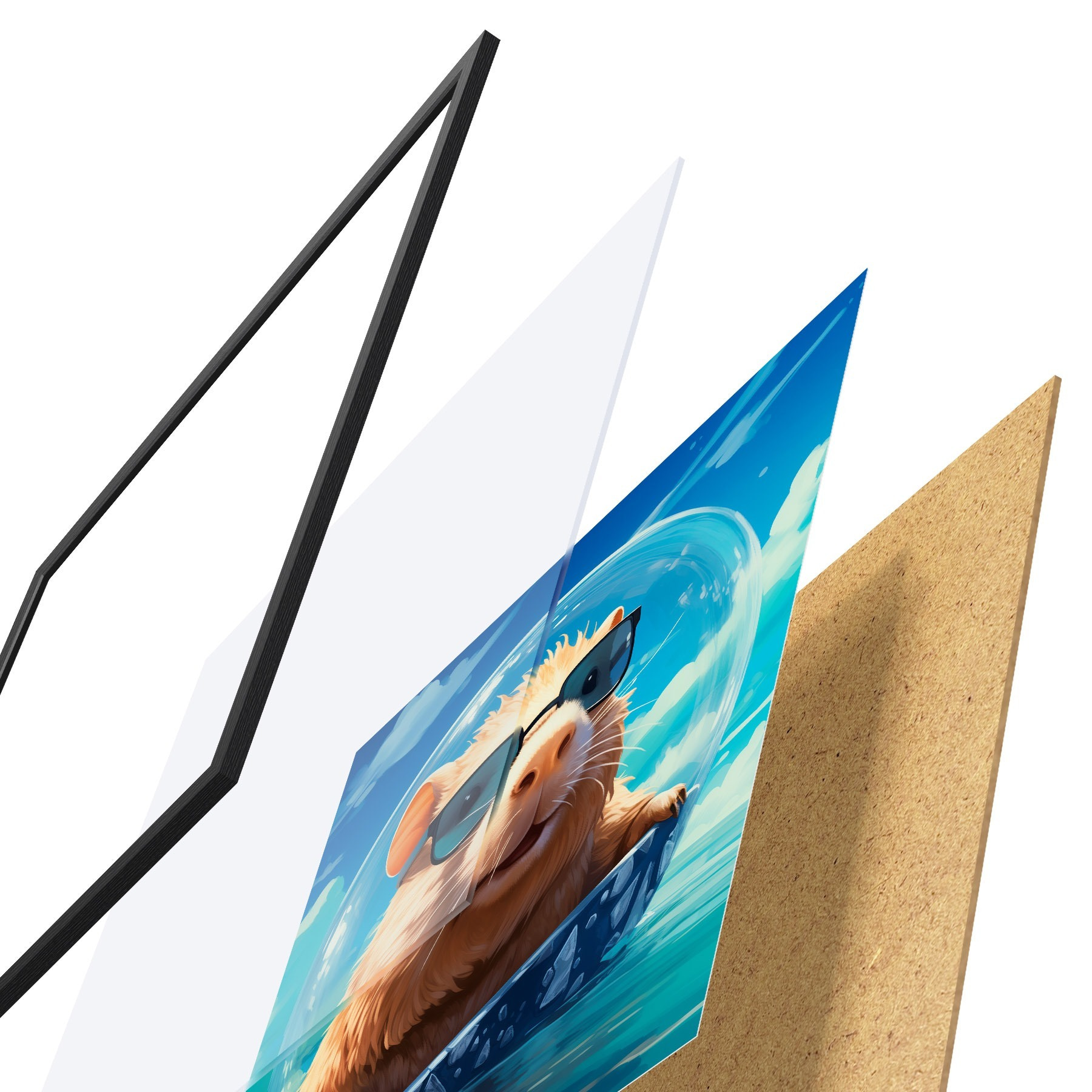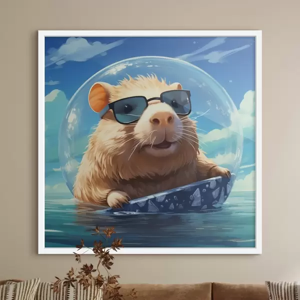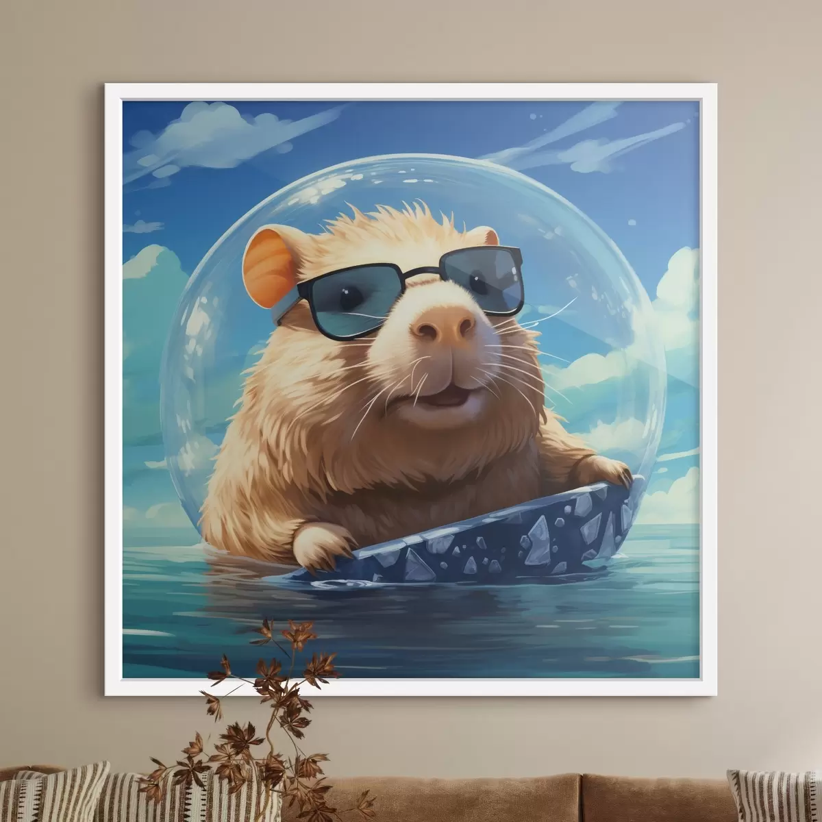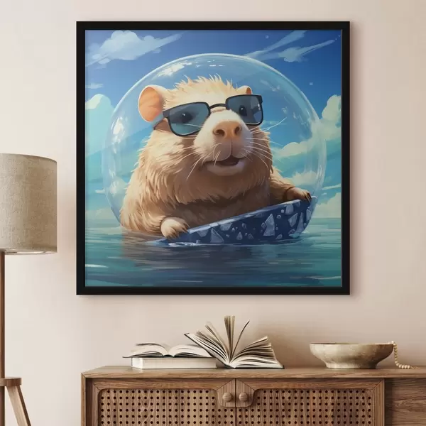 Plakatas Linksma kapibara skaidriame burbule ant vandens Ne f45029