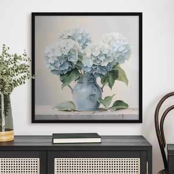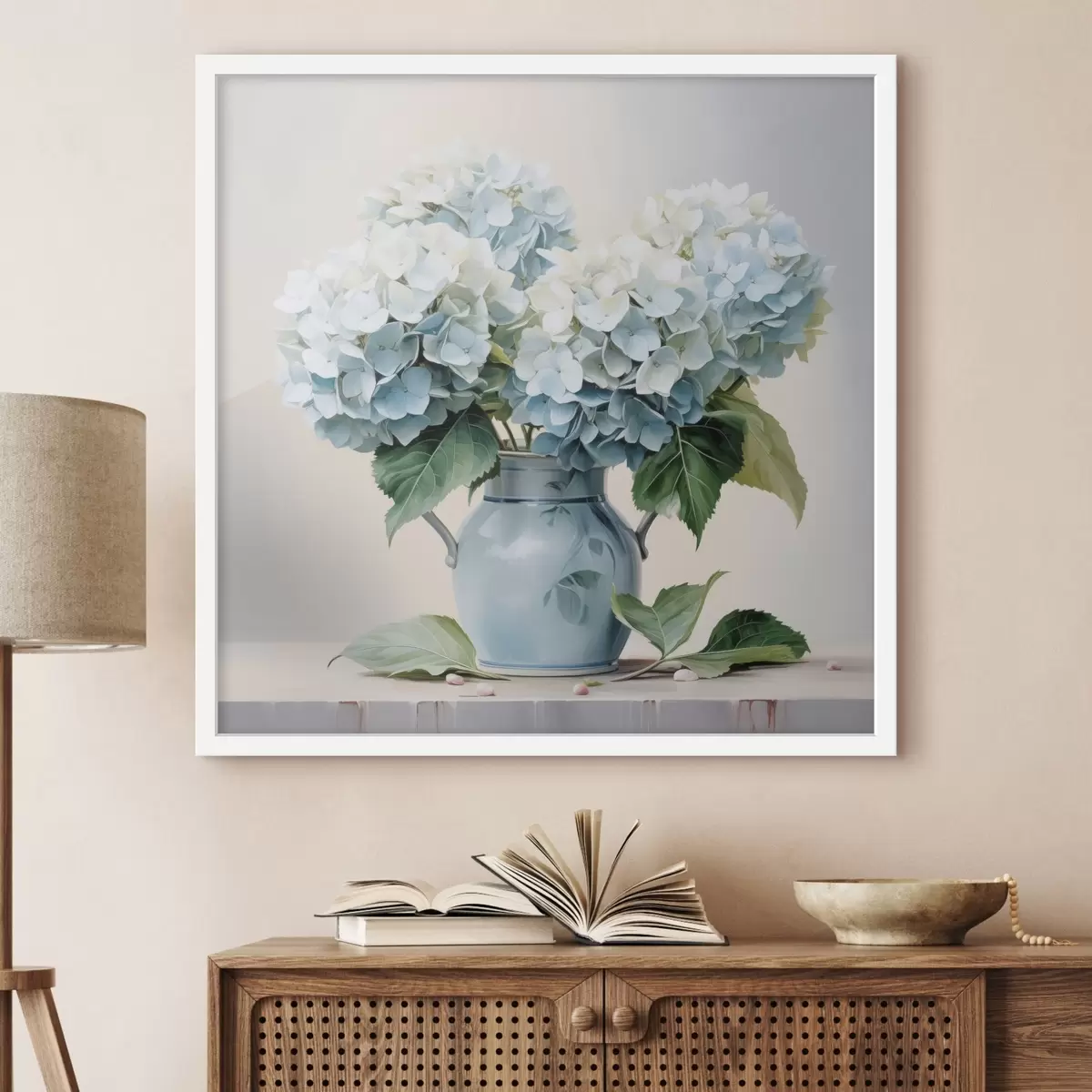 Plakatas Šviežios hortenzijos mėlynoje vazoje šviesiame fone Ne f45043