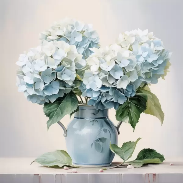 Plakatas Šviežios hortenzijos mėlynoje vazoje šviesiame fone f45043