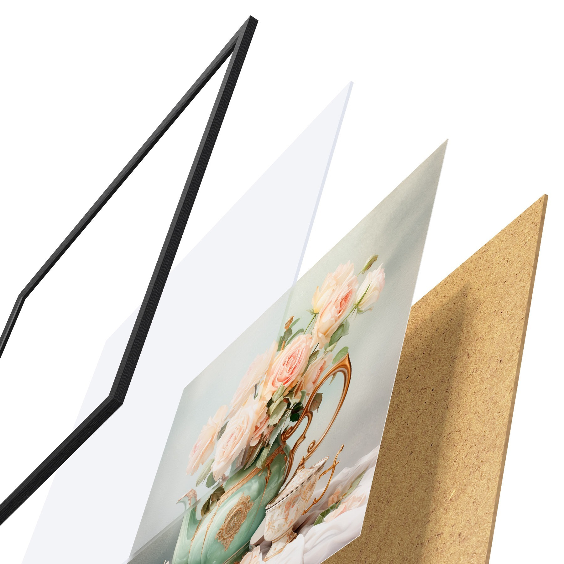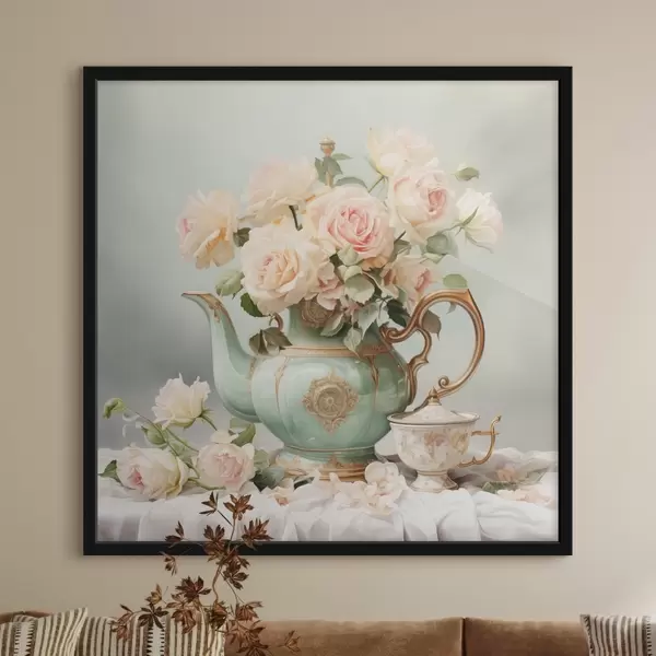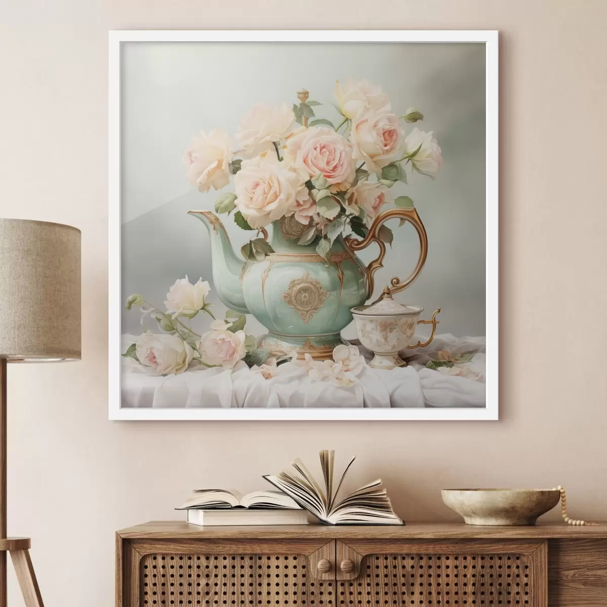Plakatas Natiurmortas su subtiliomis rožėmis arbatos rinkinyje f45045