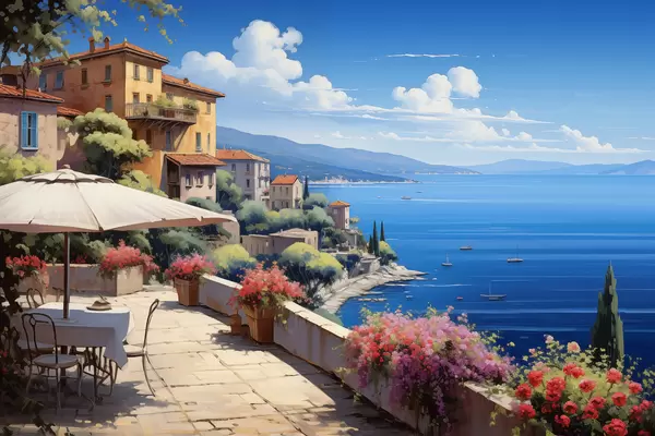 Plakatas Viduržemio jūros kraštovaizdis su žydinčia meninio stiliaus terasa f45053
