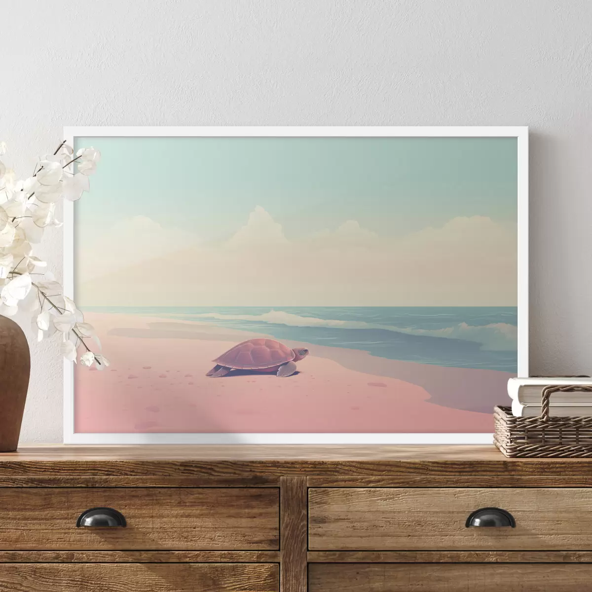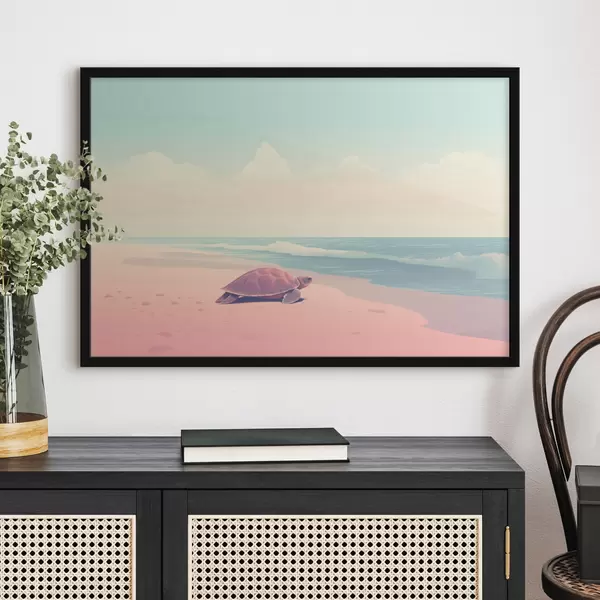 Plakatas Jūrų vėžlys rausvame paplūdimyje: minimalistinis kraštovaizdis f45059