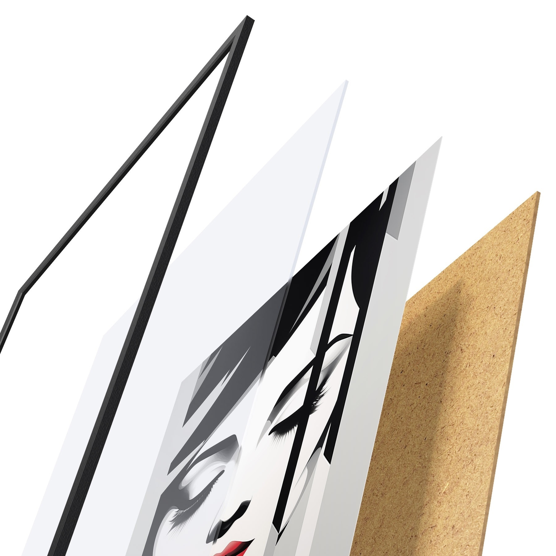 Plakatą sudaro rėmas, pleksiklas, atspausdintas vaizdas ir medžio drožlių plokštės pagrindas. Plakatą galima iš karto pakabinti ant sienos dėl kitoje pusėje esančių laikiklių.