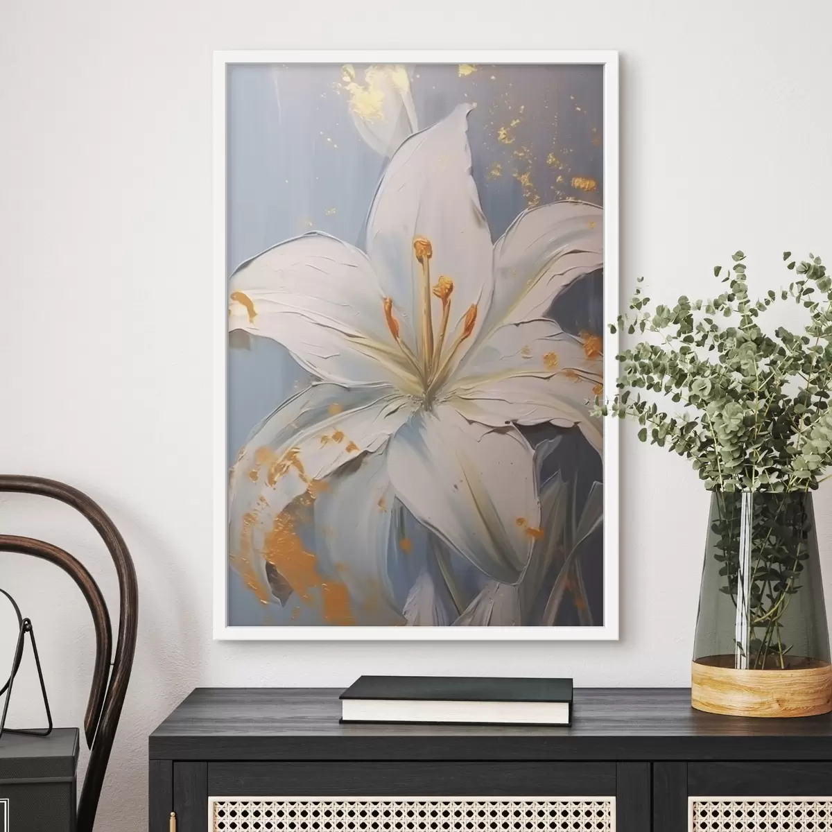 Plakatas Balta lelija su geltonais akcentais mėlyname fone f45078