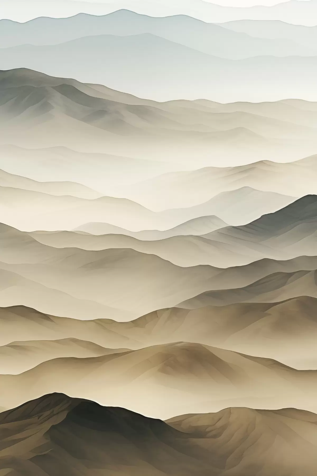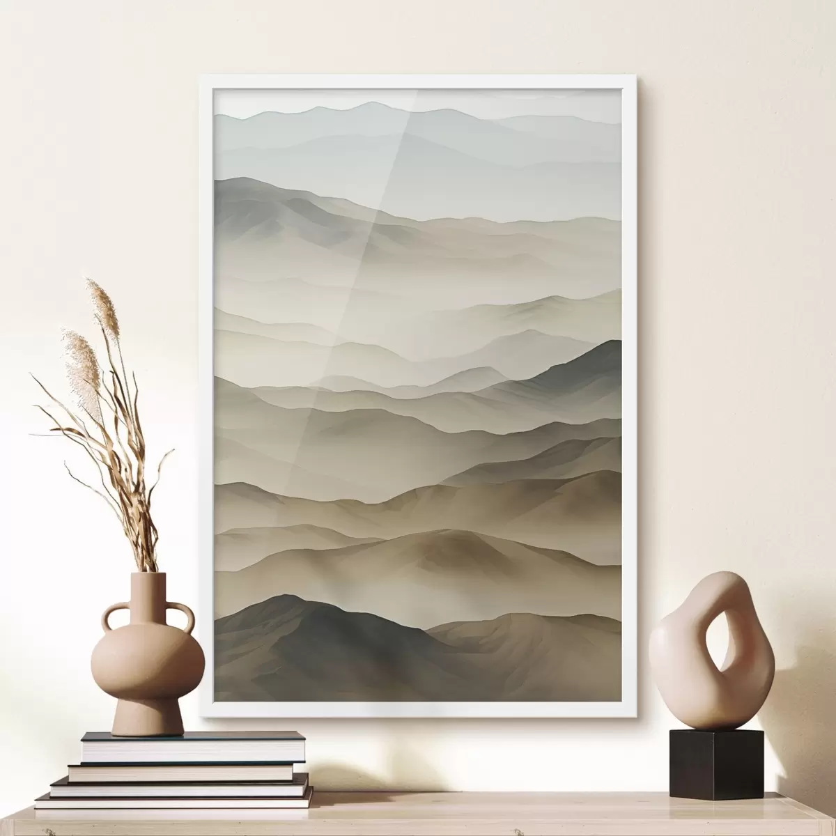 Plakatas kalvos, rūkas, neutralūs tonai, tekančios linijos, žemė, minkšti kraštai, gamta, gylis Ne f45096
