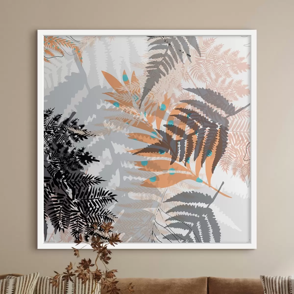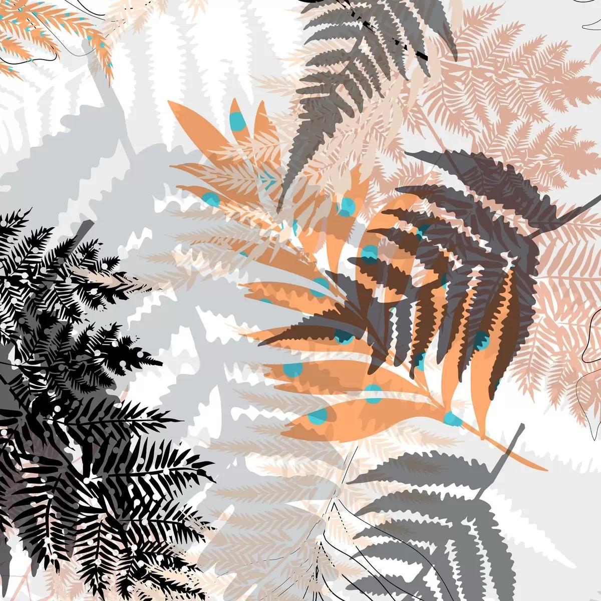 Plakatas džiunglių lapija, modernus stilius, linijų menas, sluoksniuoti augalai, prislopintos spalvos, gamta f45102