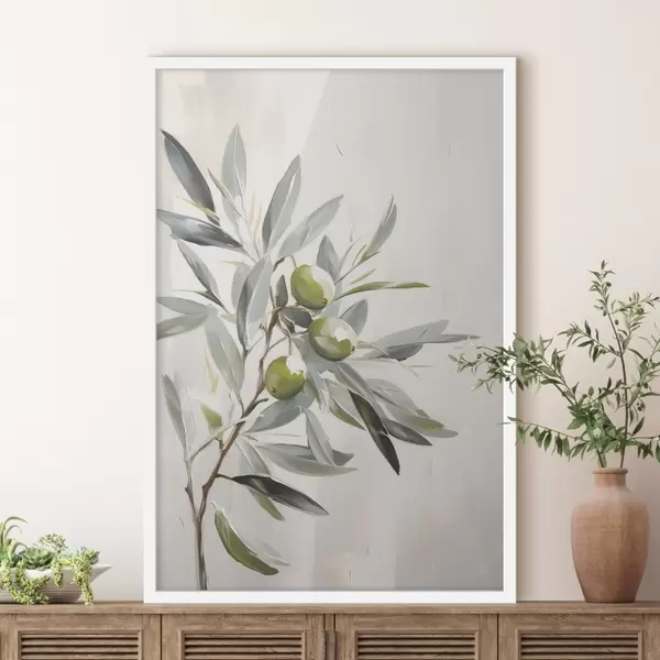 Plakatas alyvmedžio šakelė, žali vaisiai, prislopinti tonai, lapai, minimalus, natūralus, aliejinė tapyba, botaninis f45109