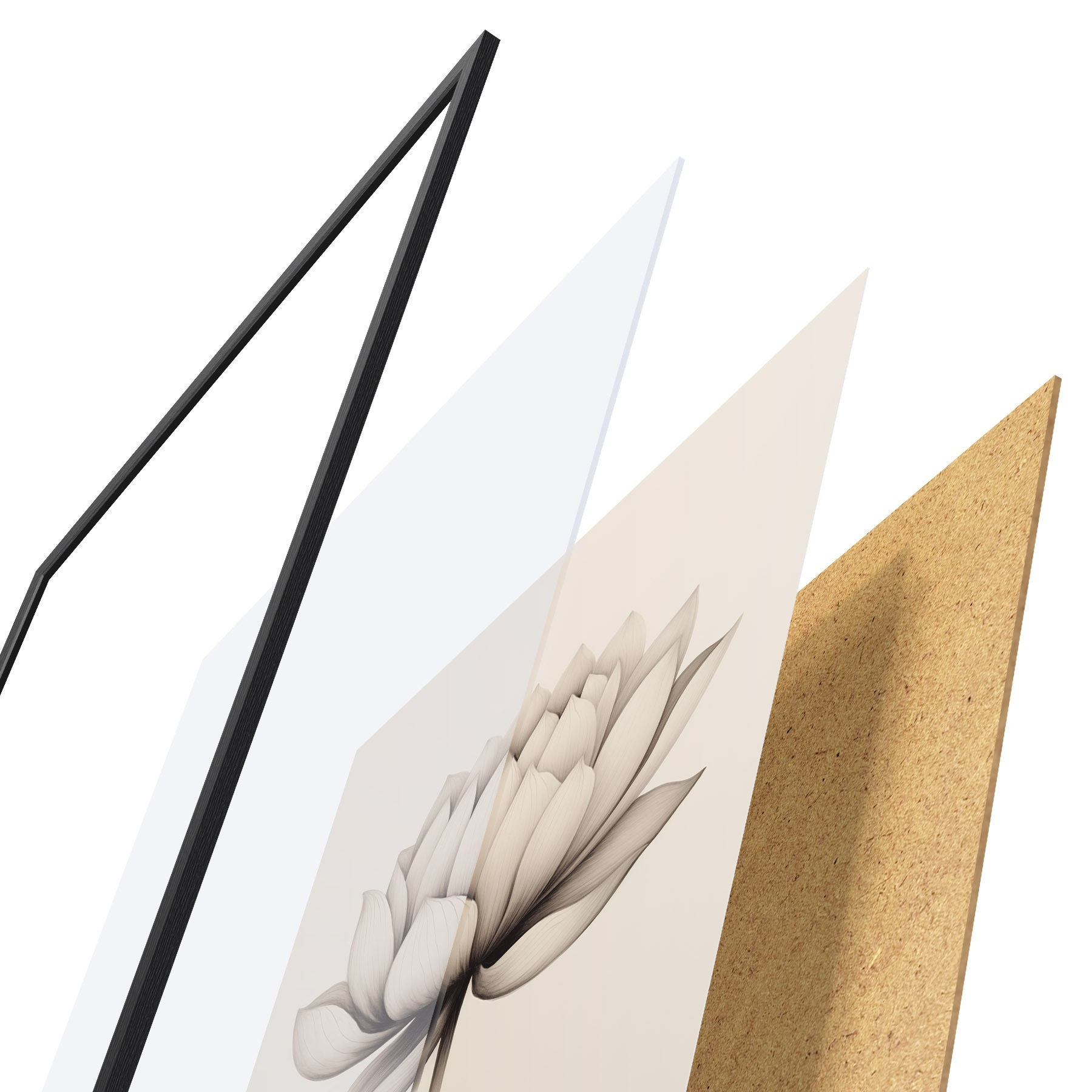 Plakatą sudaro rėmas, pleksiklas, atspausdintas vaizdas ir medžio drožlių plokštės pagrindas. Plakatą galima iš karto pakabinti ant sienos dėl kitoje pusėje esančių laikiklių.