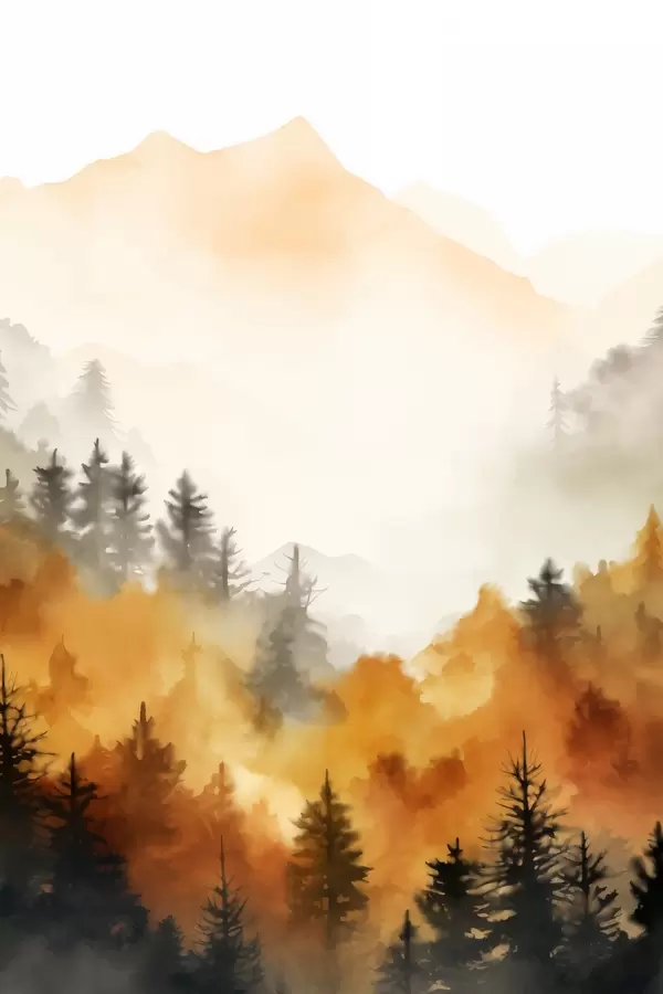 Plakatas Peizažo akvarele tapyba, imituojanti mišką su aukštomis pušimis ir kalnais fone f45169