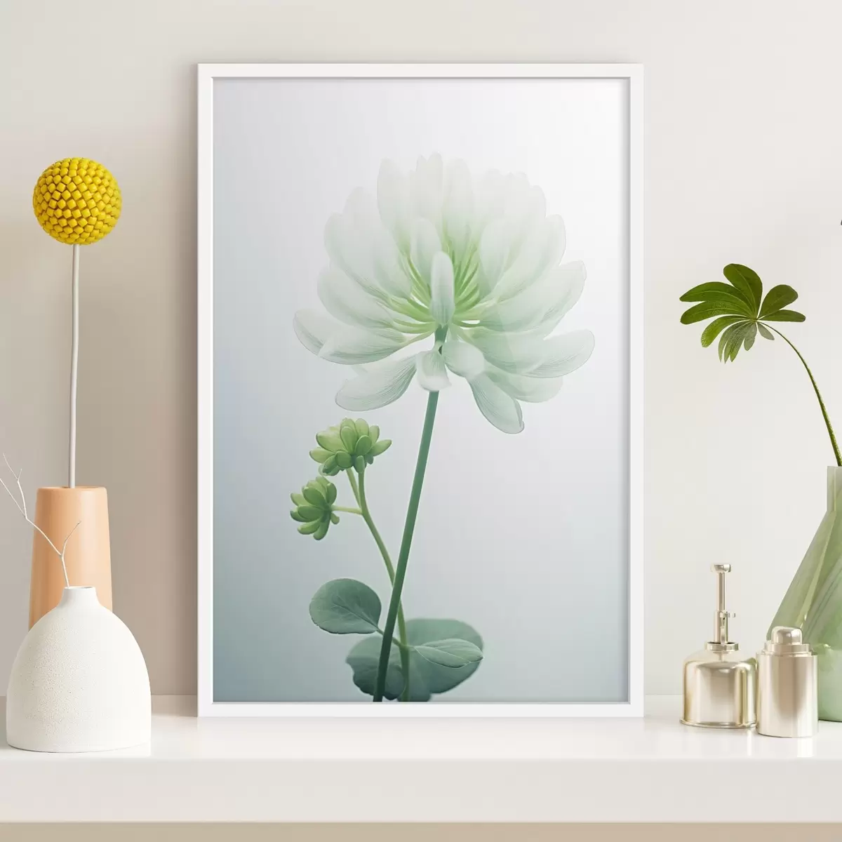 Plakatas Balto dobilo gėlė su žaliu stiebu ir lapais, minkštas apšvietimas, švarus fonas, minimalistinė kompozicija, botaninis f45171