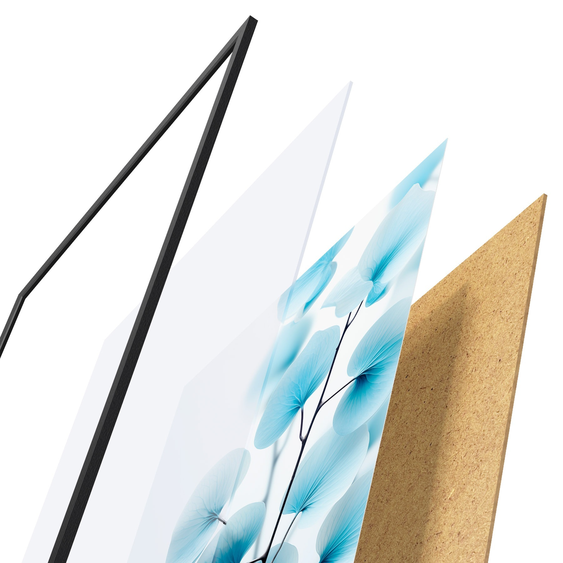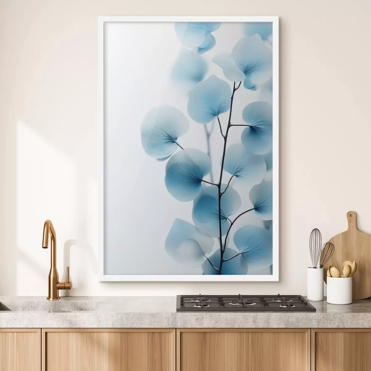 Plakatas Šaka su permatomais mėlynais lapais, matomos subtilios gyslos, lengva ir rami kompozicija, minimalistinė estetika Ne f45176