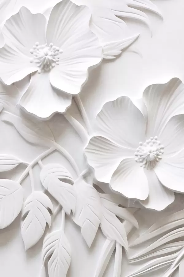 Plakatas Dekoratyvios minimalistinės baltos gėlės su lapais, reljefo imitacija, baltas fonas f45179