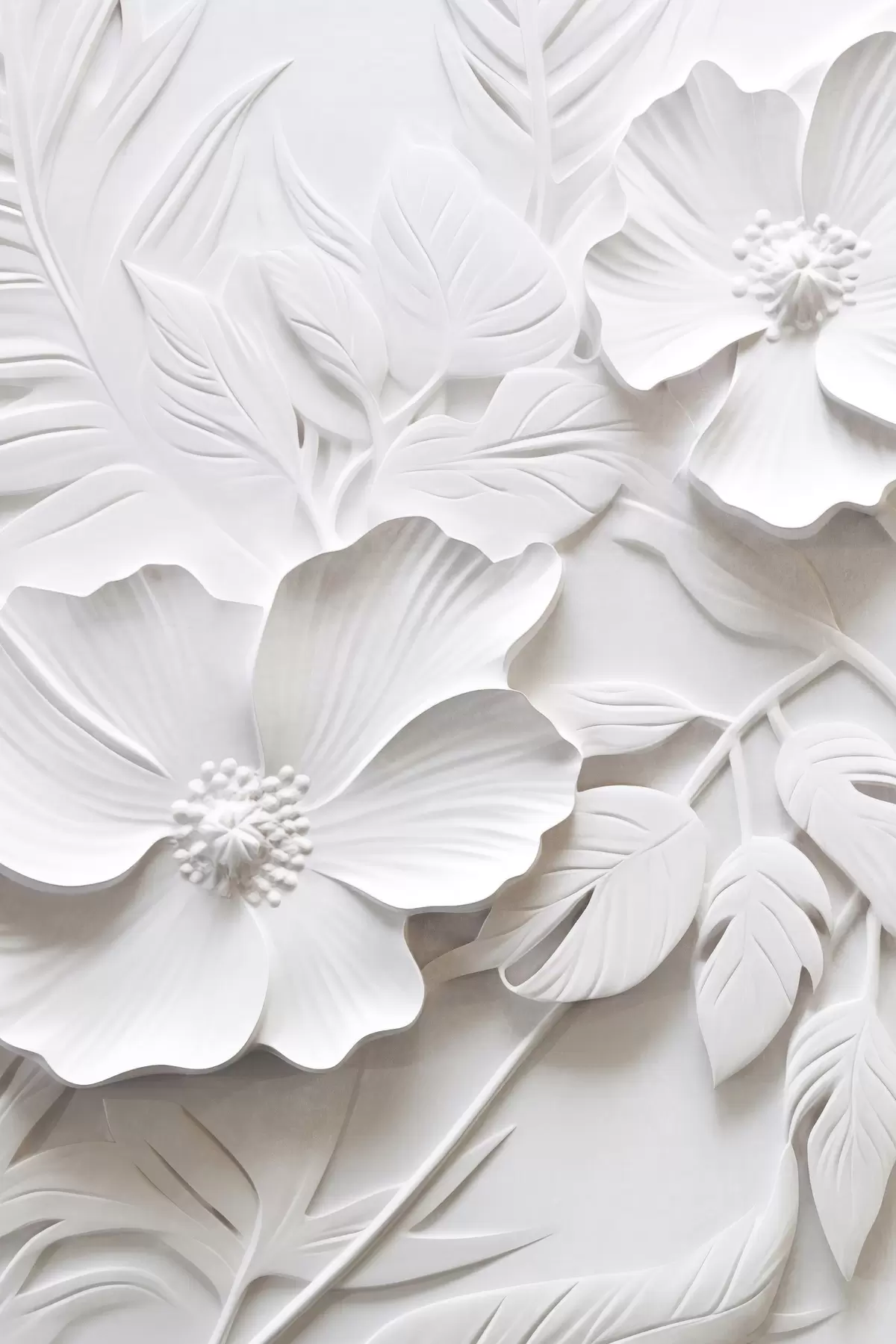 Plakatas Dekoratyvios minimalistinės baltos gėlės su lapais, reljefo imitacija, baltas fonas f45180