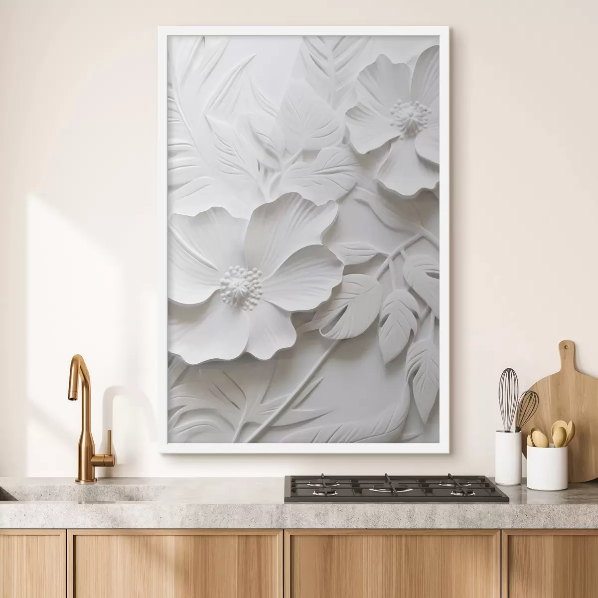 Plakatas Dekoratyvios minimalistinės baltos gėlės su lapais, reljefo imitacija, baltas fonas Ne f45180