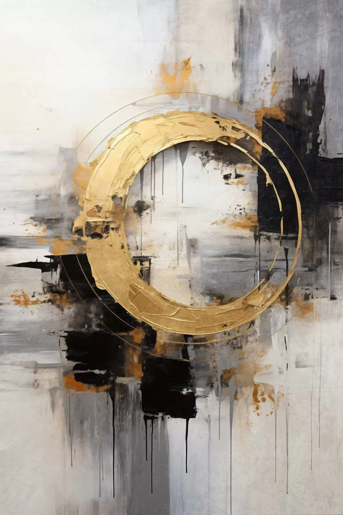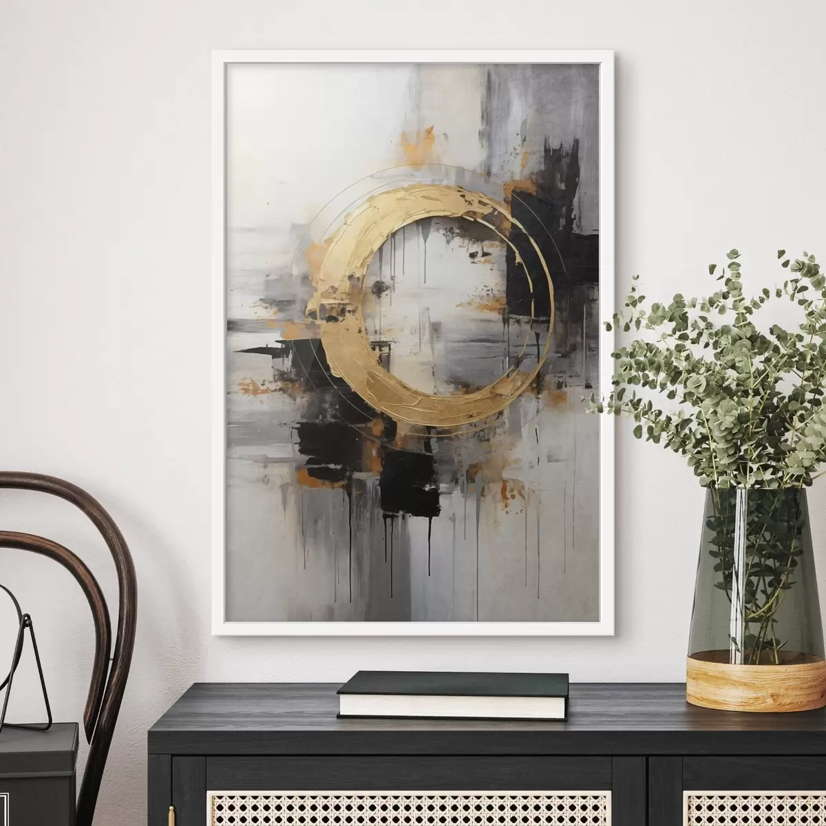 Plakatas Abstraktus paveikslas su apskritimais, juodomis ir geltonomis linijomis bei pilkų ir baltų tonų fonu f45186