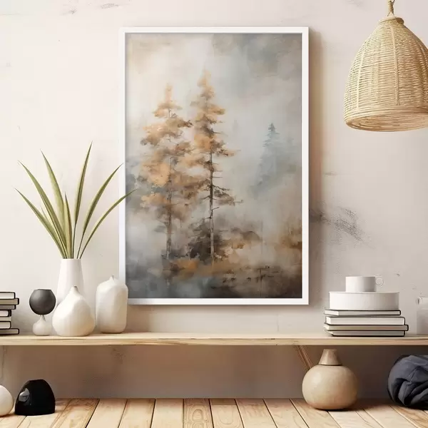 Plakatas Tekstūruoti aukšti medžiai su geltonais lapais miške , fone susipina švelnūs mėlyni ir rudi tonai Ne f45188