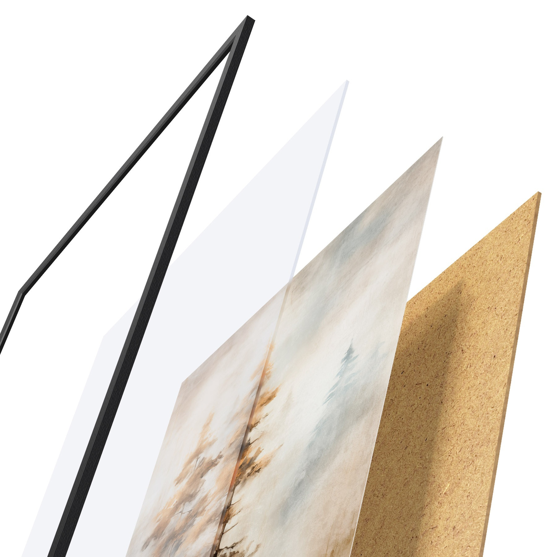 Plakatą sudaro rėmas, pleksiklas, atspausdintas vaizdas ir medžio drožlių plokštės pagrindas. Plakatą galima iš karto pakabinti ant sienos dėl kitoje pusėje esančių laikiklių.