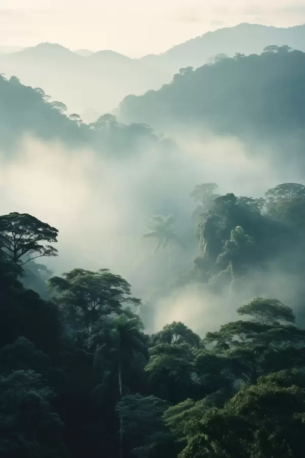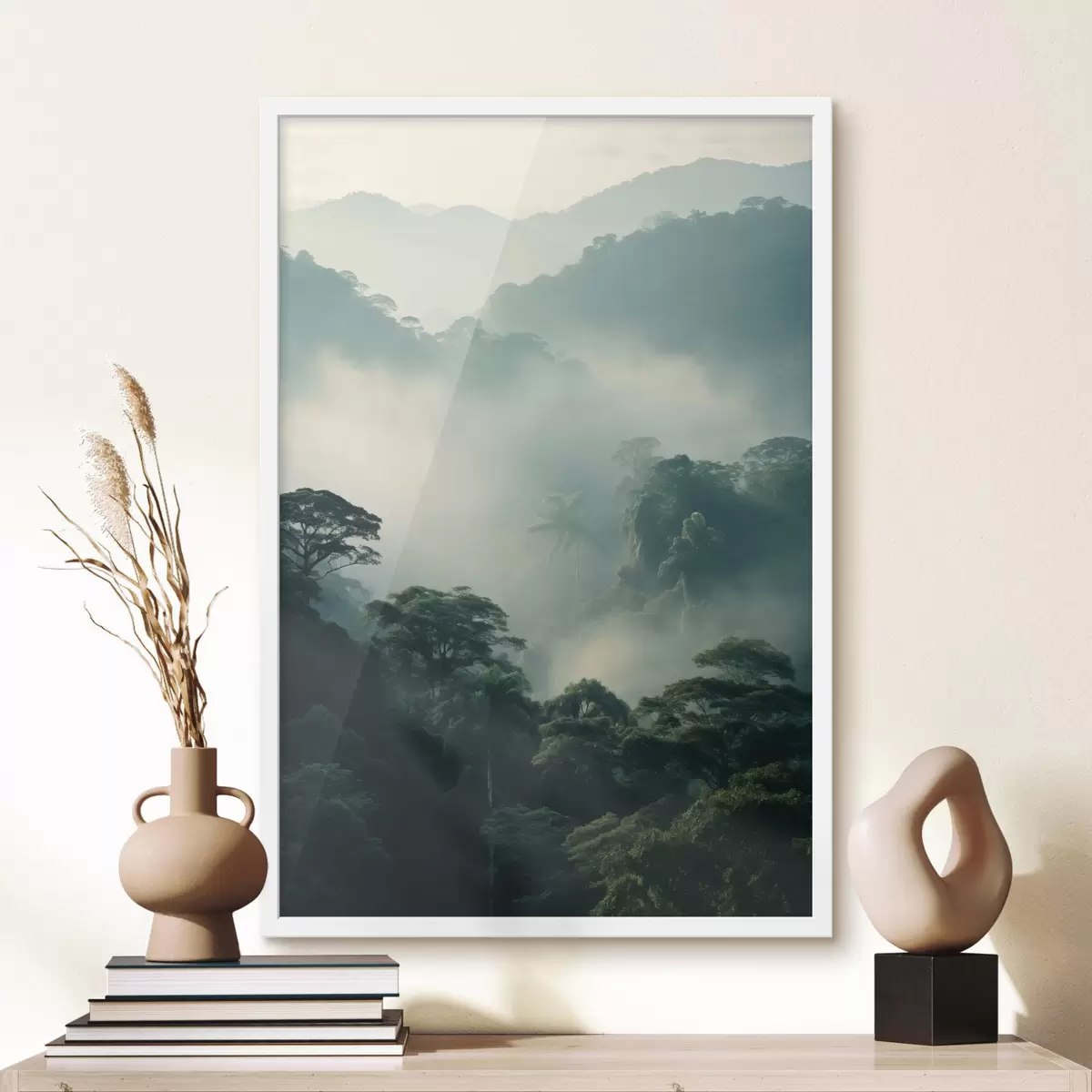 Plakatas Atogrąžų atogrąžų miškas su vešliais žaliais medžiais ir storu rūko sluoksniu, sukuriančiu atmosferinę aplinką f45189