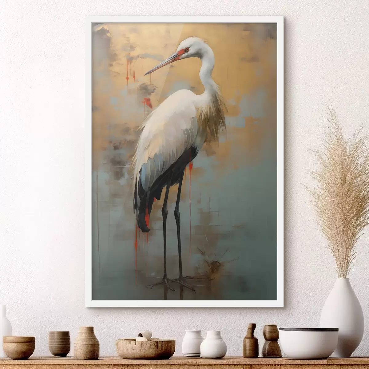 Plakatas Baltasis garnys prislopintų geltonų, rudų ir mėlynų atspalvių fone, primenančiame miglotą abstraktų peizažą f45191