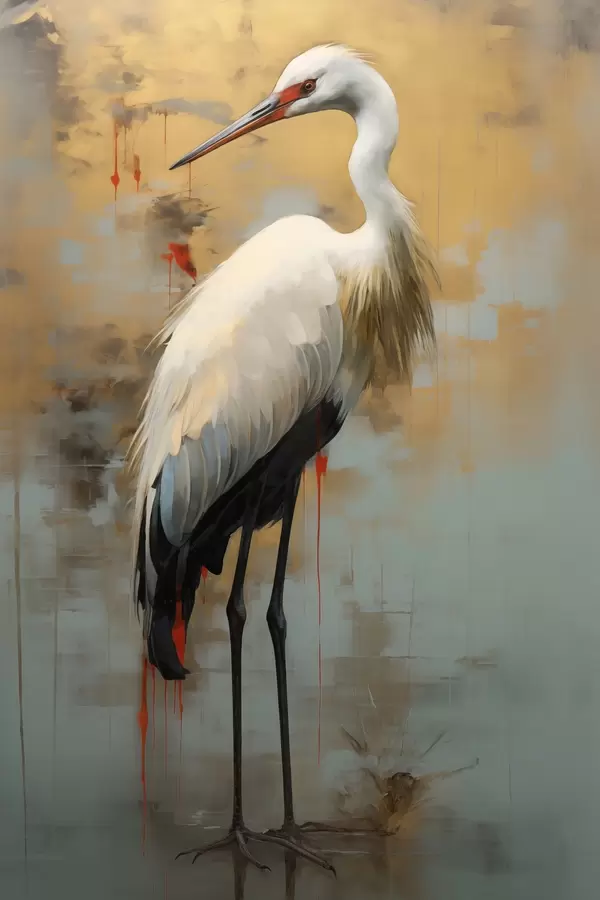 Plakatas Baltasis garnys prislopintų geltonų, rudų ir mėlynų atspalvių fone, primenančiame miglotą abstraktų peizažą f45191
