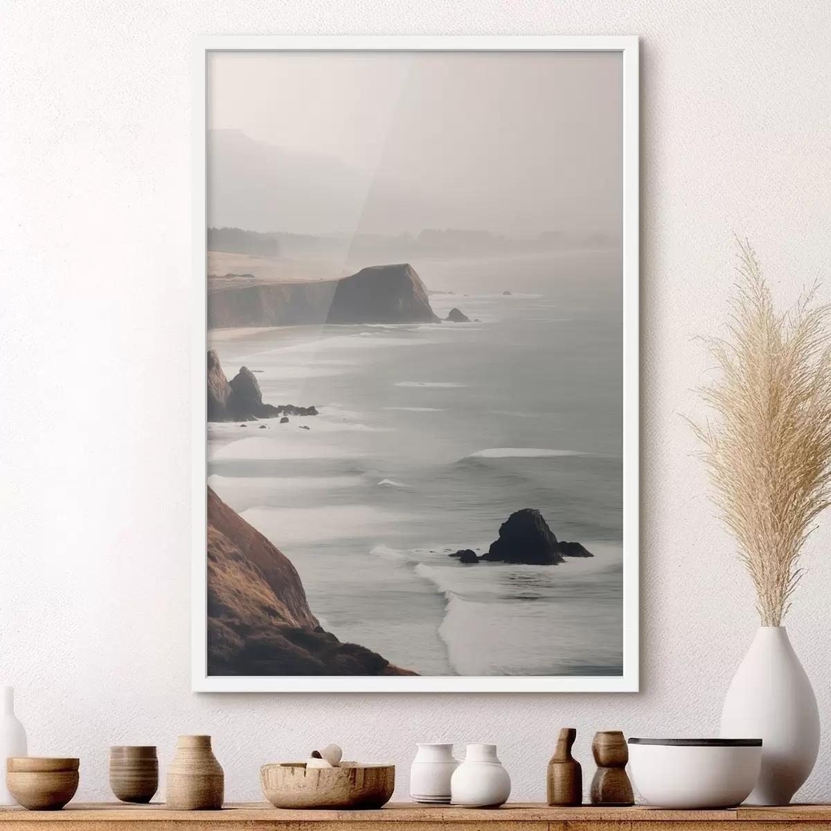 Plakatas Uolėtos uolos ir jūros pakrantė, į krantą atsimušančios bangos, nuotaikingas kraštovaizdis, žemės atspalviai f45194