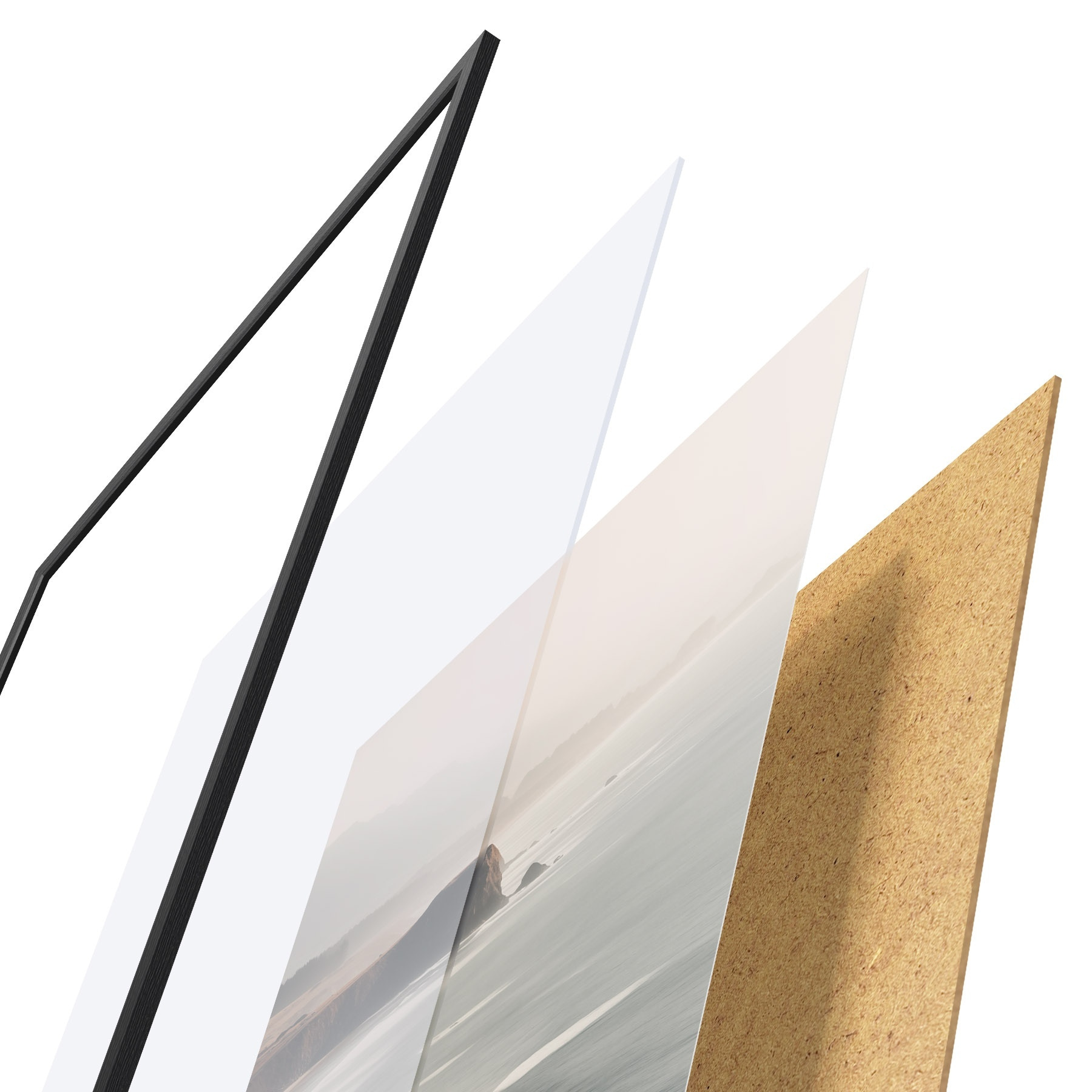 Plakatą sudaro rėmas, pleksiklas, atspausdintas vaizdas ir medžio drožlių plokštės pagrindas. Plakatą galima iš karto pakabinti ant sienos dėl kitoje pusėje esančių laikiklių.