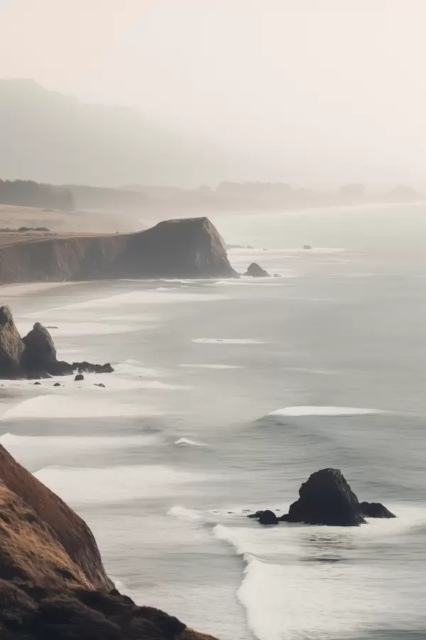Plakatas Uolėtos uolos ir jūros pakrantė, į krantą atsimušančios bangos, nuotaikingas kraštovaizdis, žemės atspalviai Ne f45194