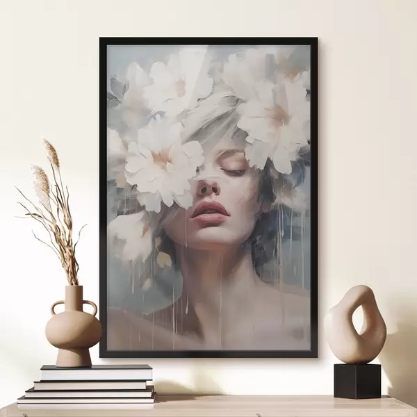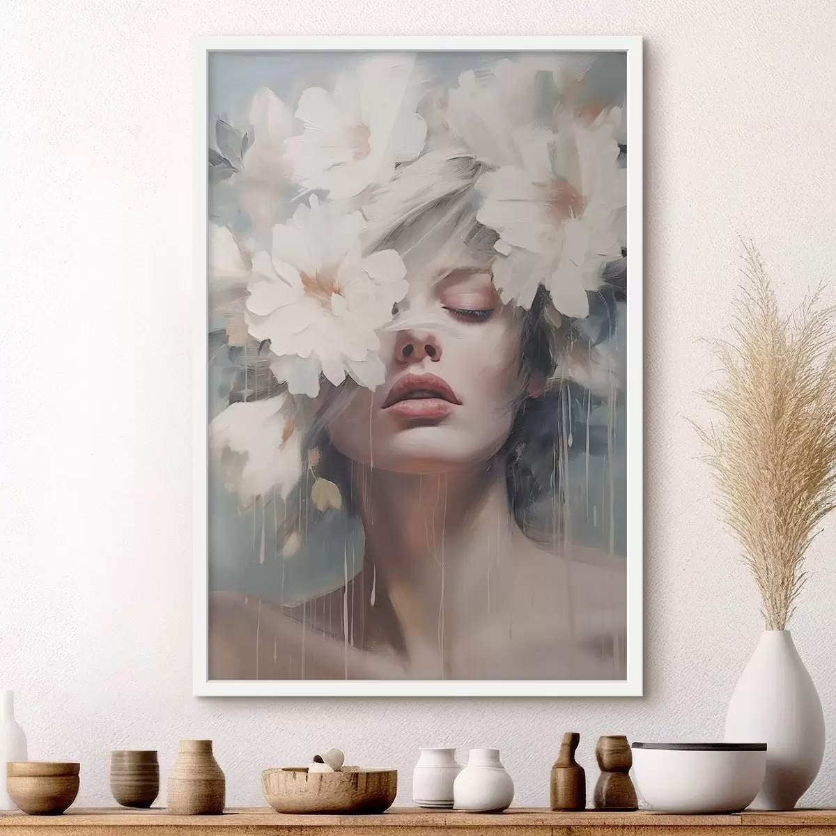 Plakatas Moters portretas su baltomis gėlėmis f45219