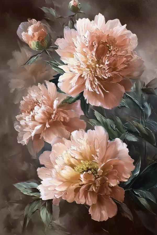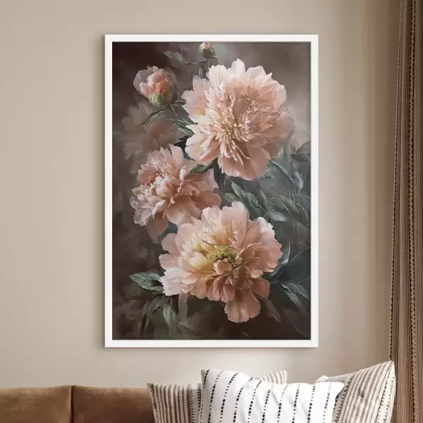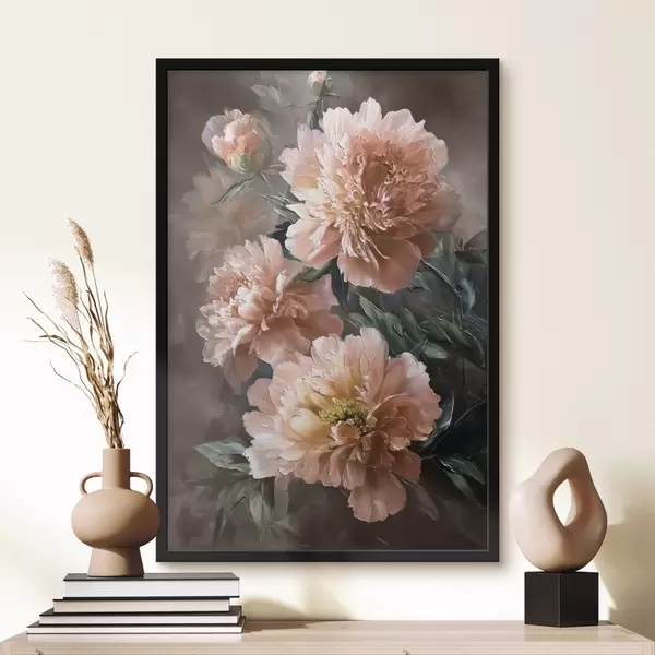 Plakatas Rausvų bijūnų puokštė su drąsiais brūkšniais tamsiame fone f45260