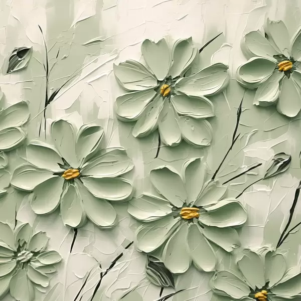 Plakatas Žalios gėlės su geltonais centrais, nutapytos storais potėpiais ant šviesaus fono f45265