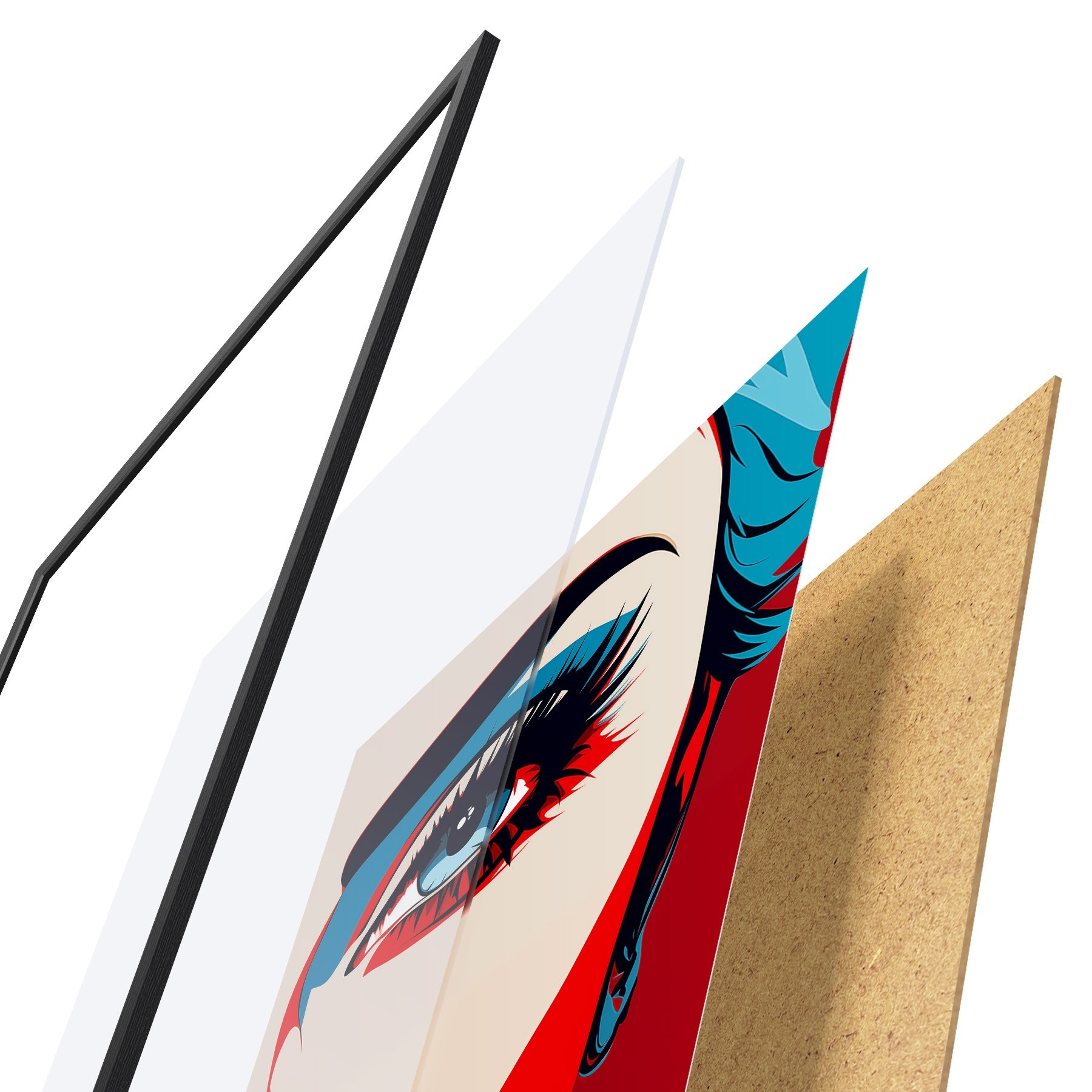 Plakatą sudaro rėmas, pleksiklas, atspausdintas vaizdas ir medžio drožlių plokštės pagrindas. Plakatą galima iš karto pakabinti ant sienos dėl kitoje pusėje esančių laikiklių.