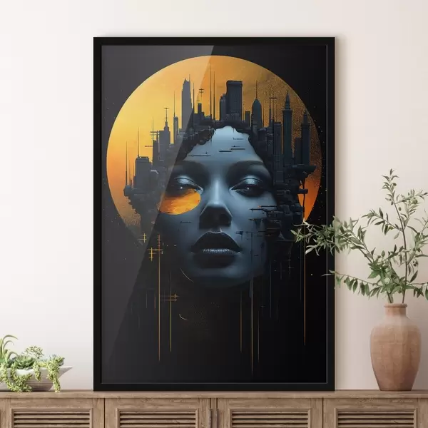 Plakatas Žmonės, mergaitės veidas miesto fone, abstraktus f45341