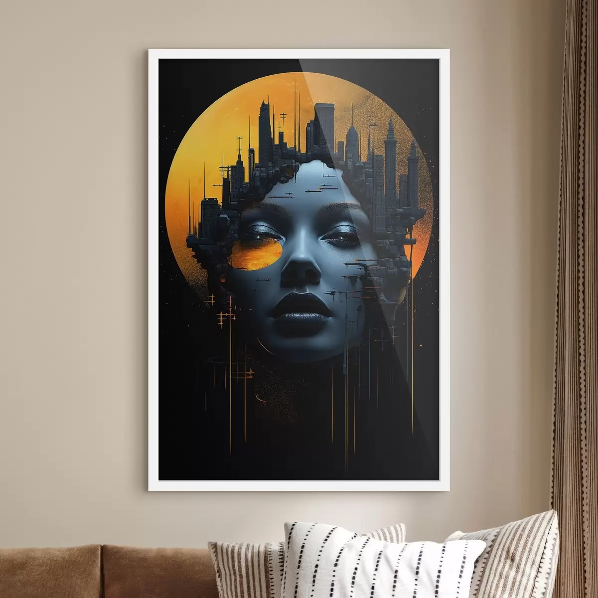 Plakatas Žmonės, mergaitės veidas miesto fone, abstraktus Ne f45341