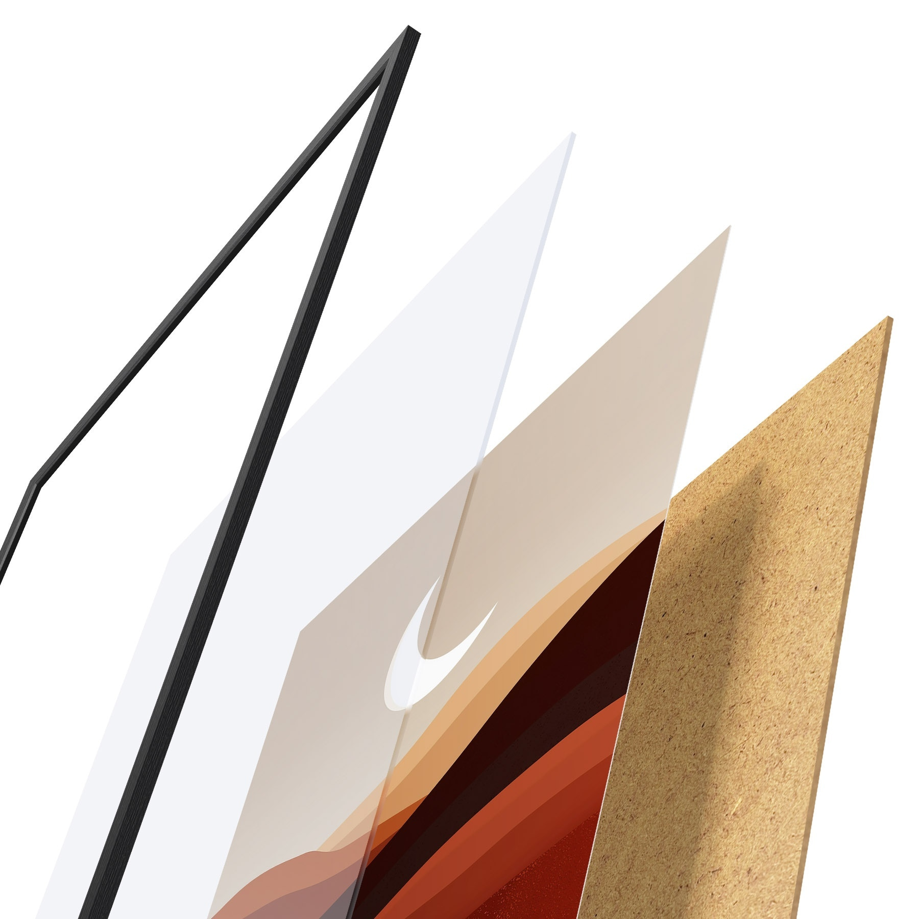 Plakatą sudaro rėmas, pleksiklas, atspausdintas vaizdas ir medžio drožlių plokštės pagrindas. Plakatą galima iš karto pakabinti ant sienos dėl kitoje pusėje esančių laikiklių.