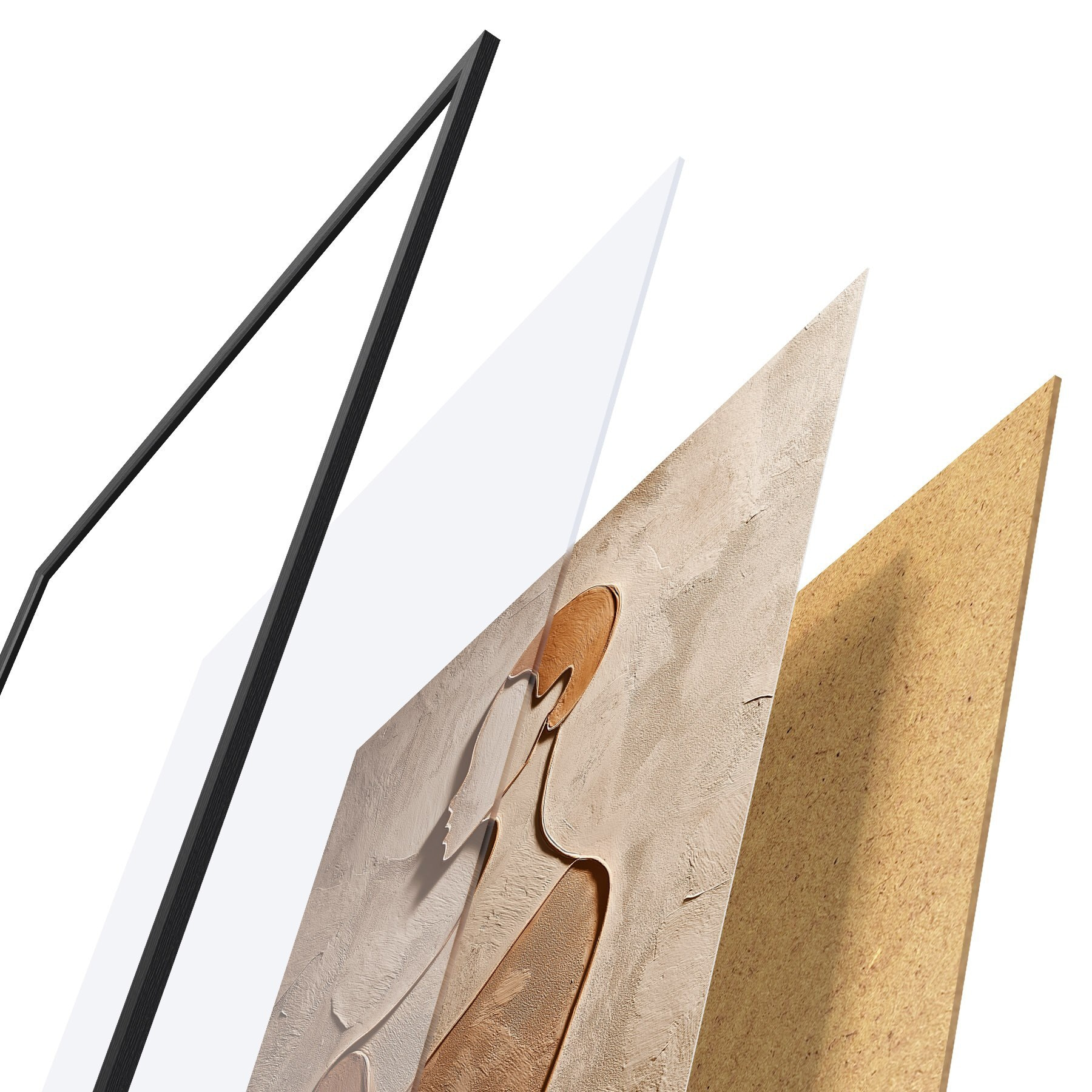 Plakatą sudaro rėmas, pleksiklas, atspausdintas vaizdas ir medžio drožlių plokštės pagrindas. Plakatą galima iš karto pakabinti ant sienos dėl kitoje pusėje esančių laikiklių.