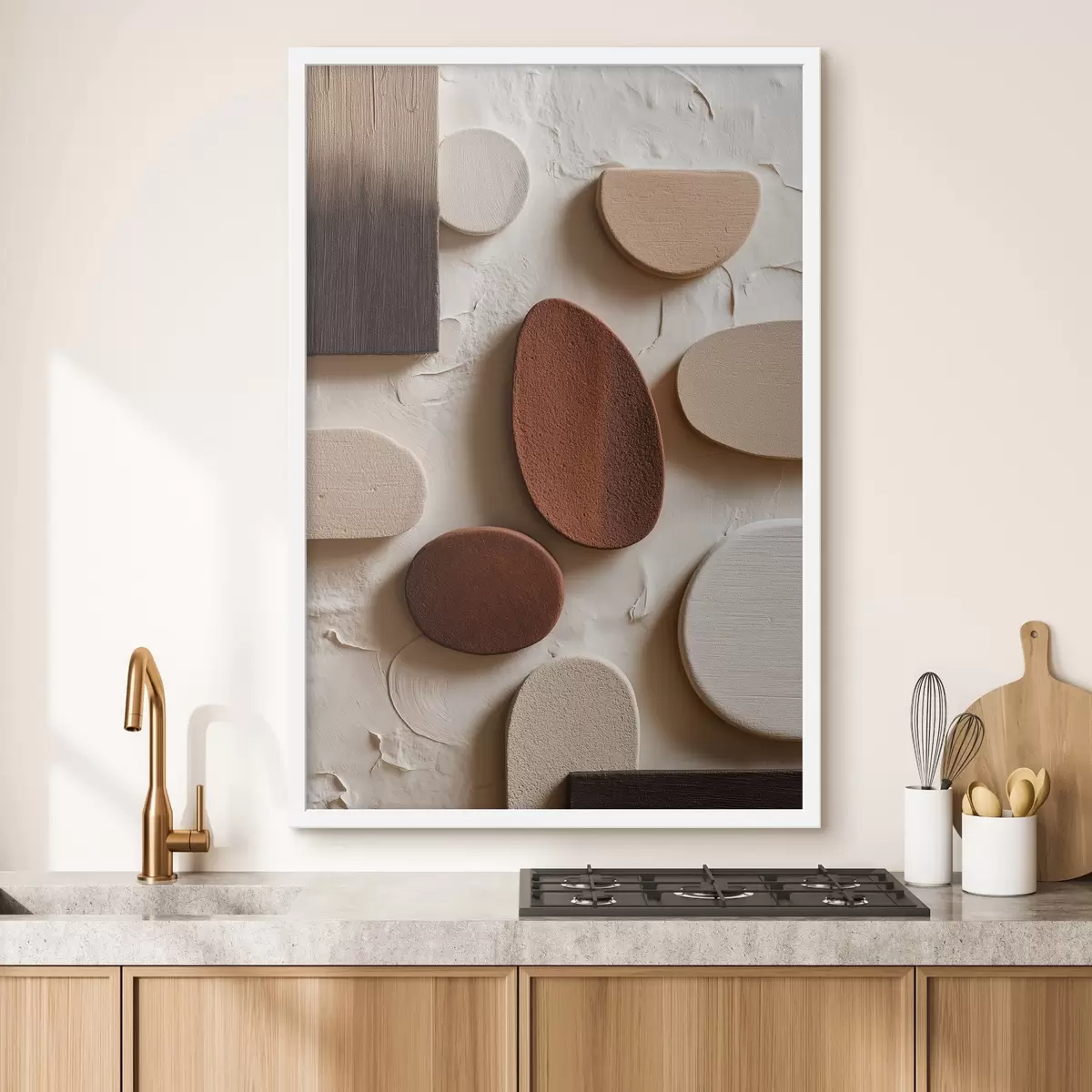 Plakatas Abstrakti kompozicija su trimatėmis geometrinėmis figūromis reljefiniame fone Ne f45409