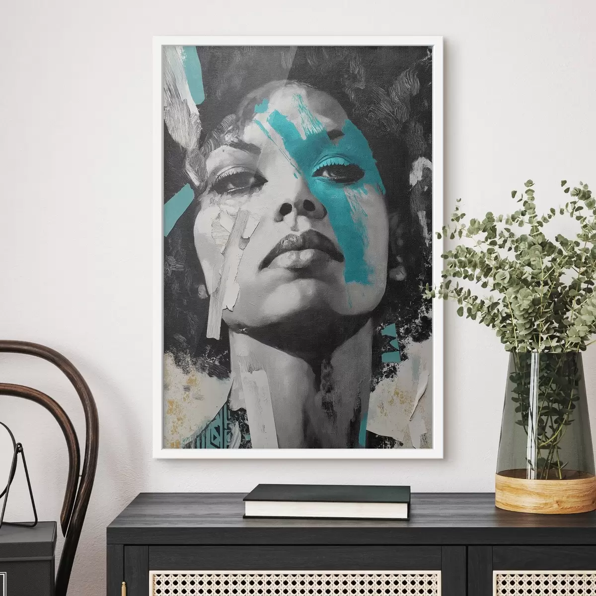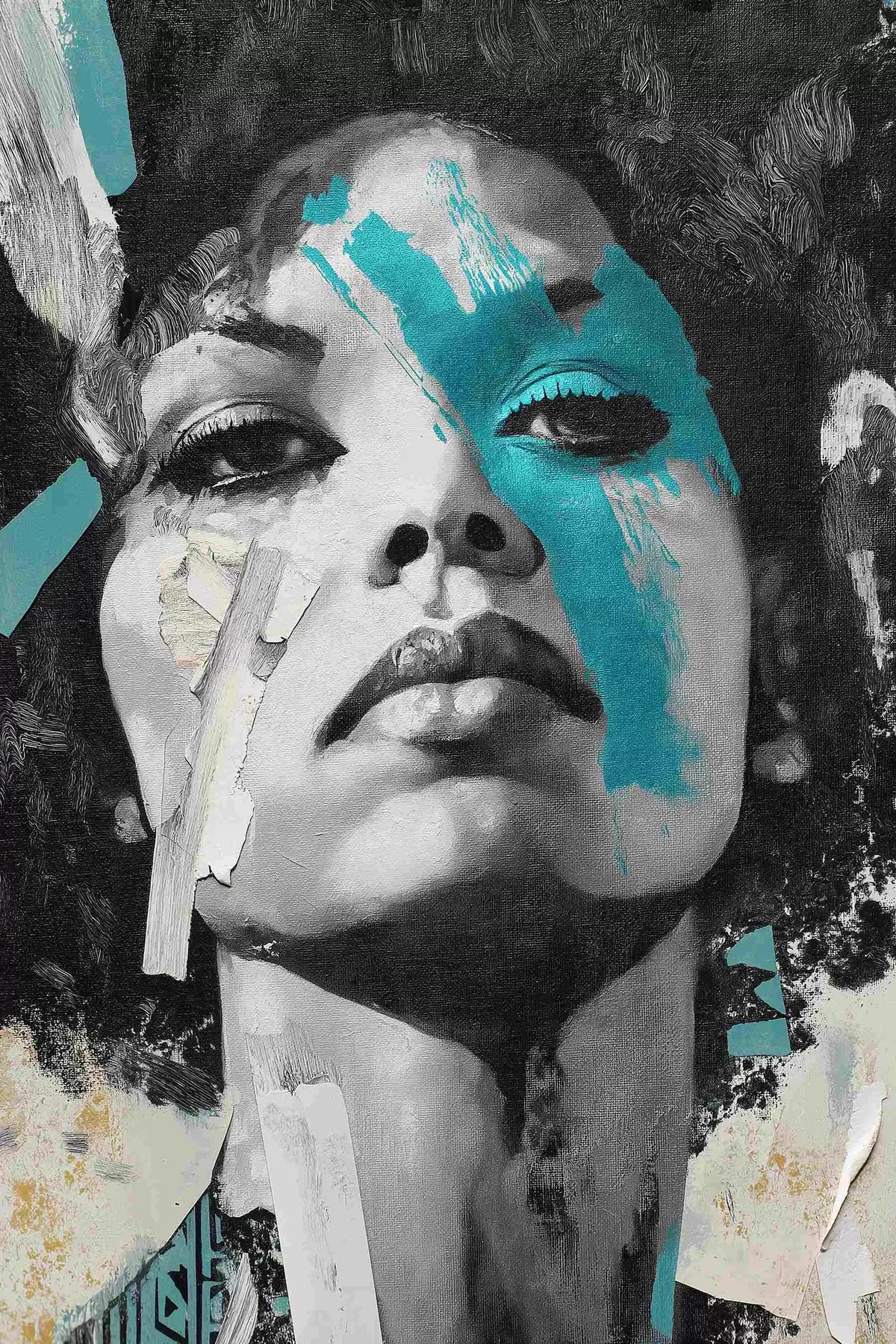 Plakatas Mišriosios medijos portretas su spalvotų potėpių ir tekstūrų fragmentais f45416