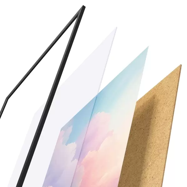 Plakatą sudaro rėmas, pleksiklas, atspausdintas vaizdas ir medžio drožlių plokštės pagrindas. Plakatą galima iš karto pakabinti ant sienos dėl kitoje pusėje esančių laikiklių.