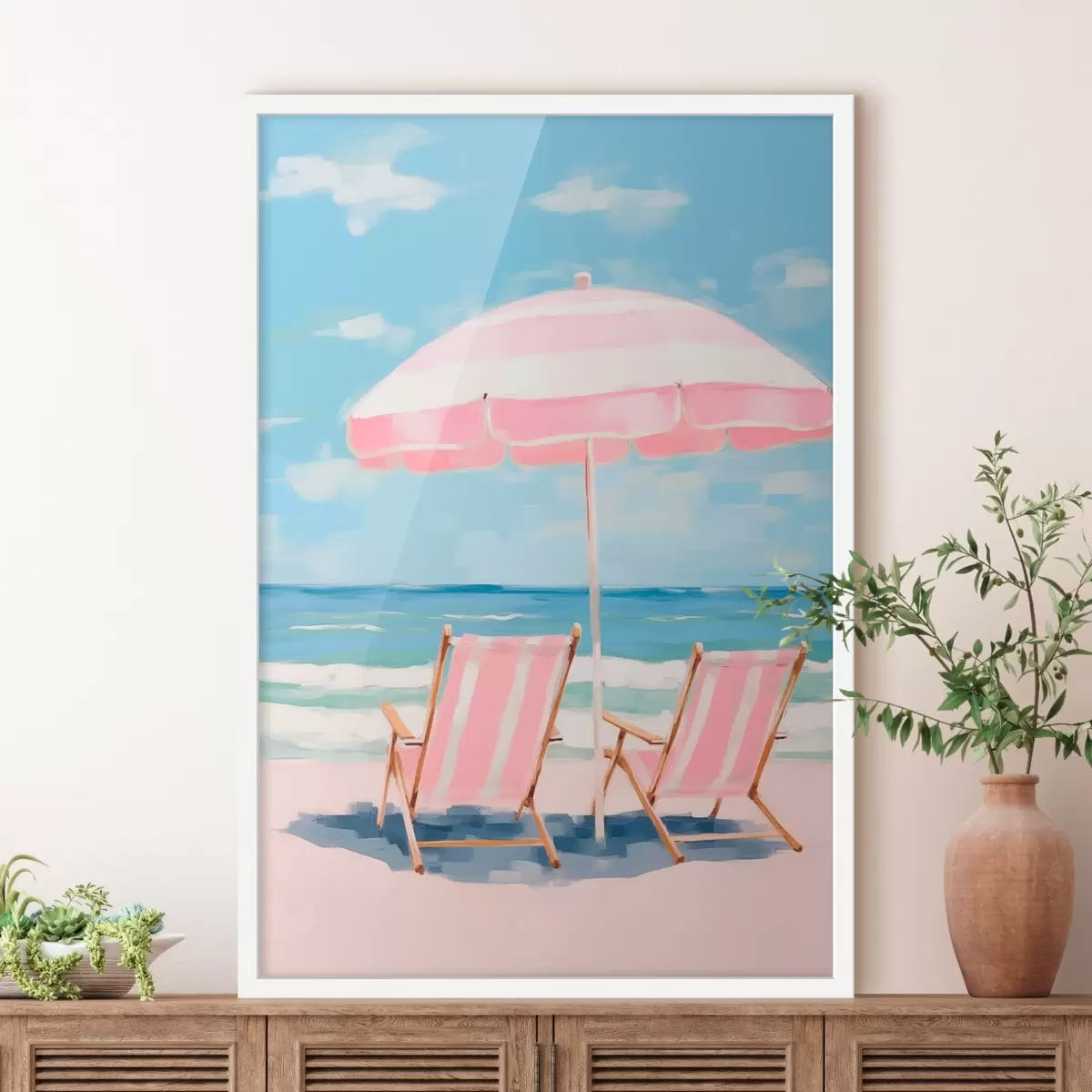 Plakatas Paplūdimio skėtis ir gultai pakrantėje Ne f45442