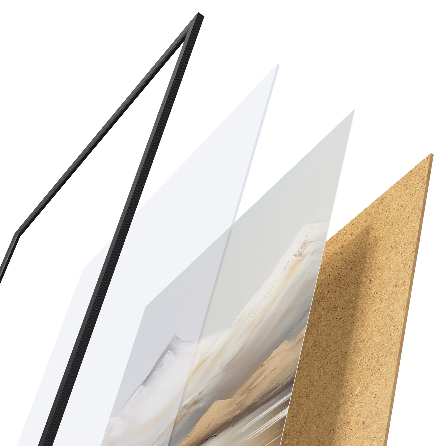 Plakatą sudaro rėmas, pleksiklas, atspausdintas vaizdas ir medžio drožlių plokštės pagrindas. Plakatą galima iš karto pakabinti ant sienos dėl kitoje pusėje esančių laikiklių.