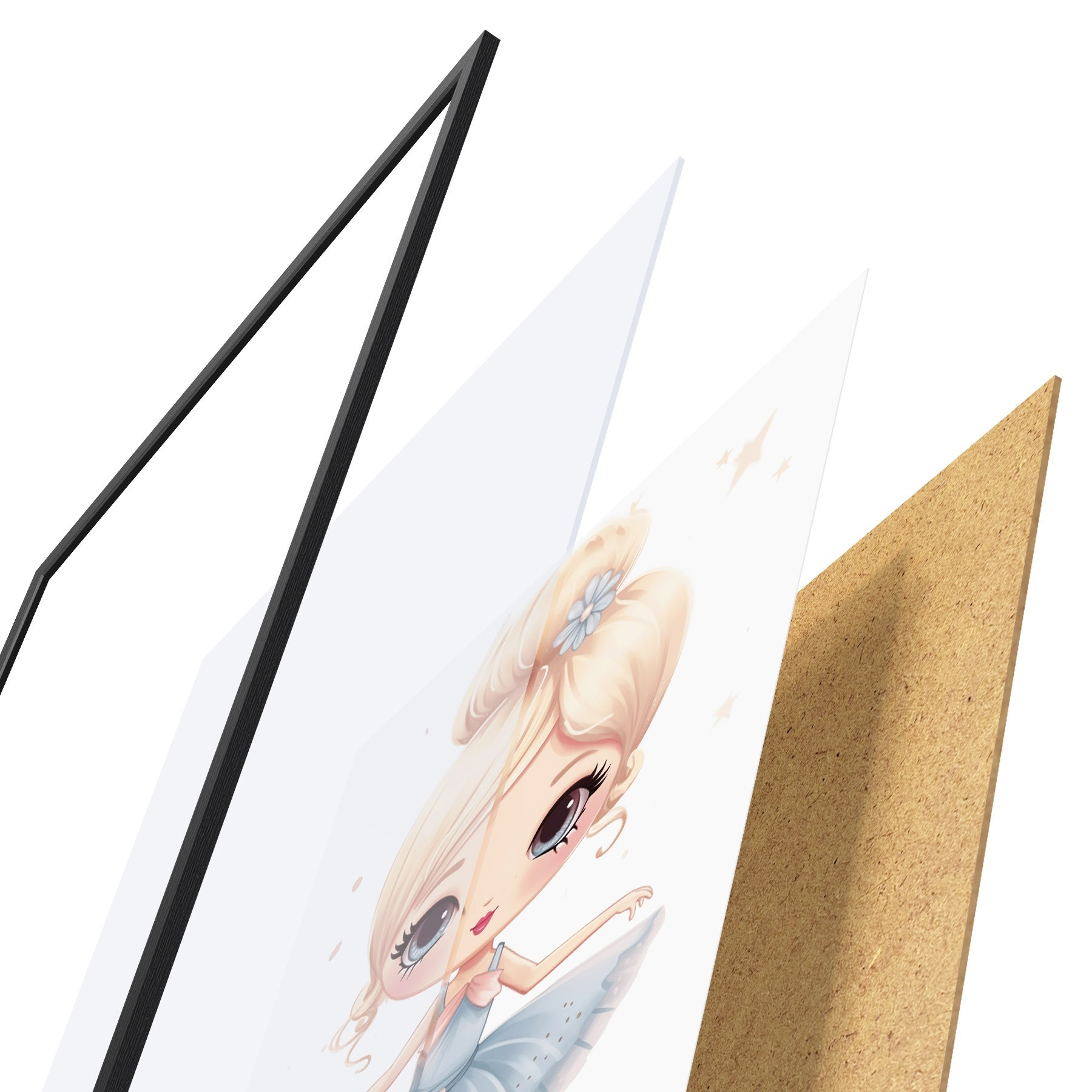 Plakatą sudaro rėmas, pleksiklas, atspausdintas vaizdas ir medžio drožlių plokštės pagrindas. Plakatą galima iš karto pakabinti ant sienos dėl kitoje pusėje esančių laikiklių.