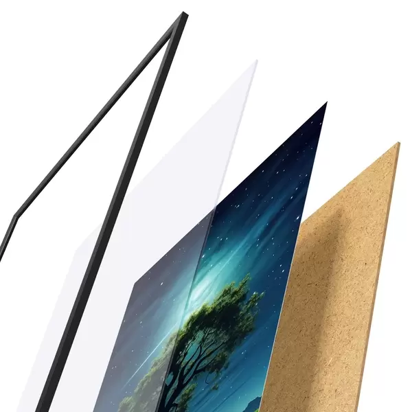 Plakatą sudaro rėmas, pleksiklas, atspausdintas vaizdas ir medžio drožlių plokštės pagrindas. Plakatą galima iš karto pakabinti ant sienos dėl kitoje pusėje esančių laikiklių.