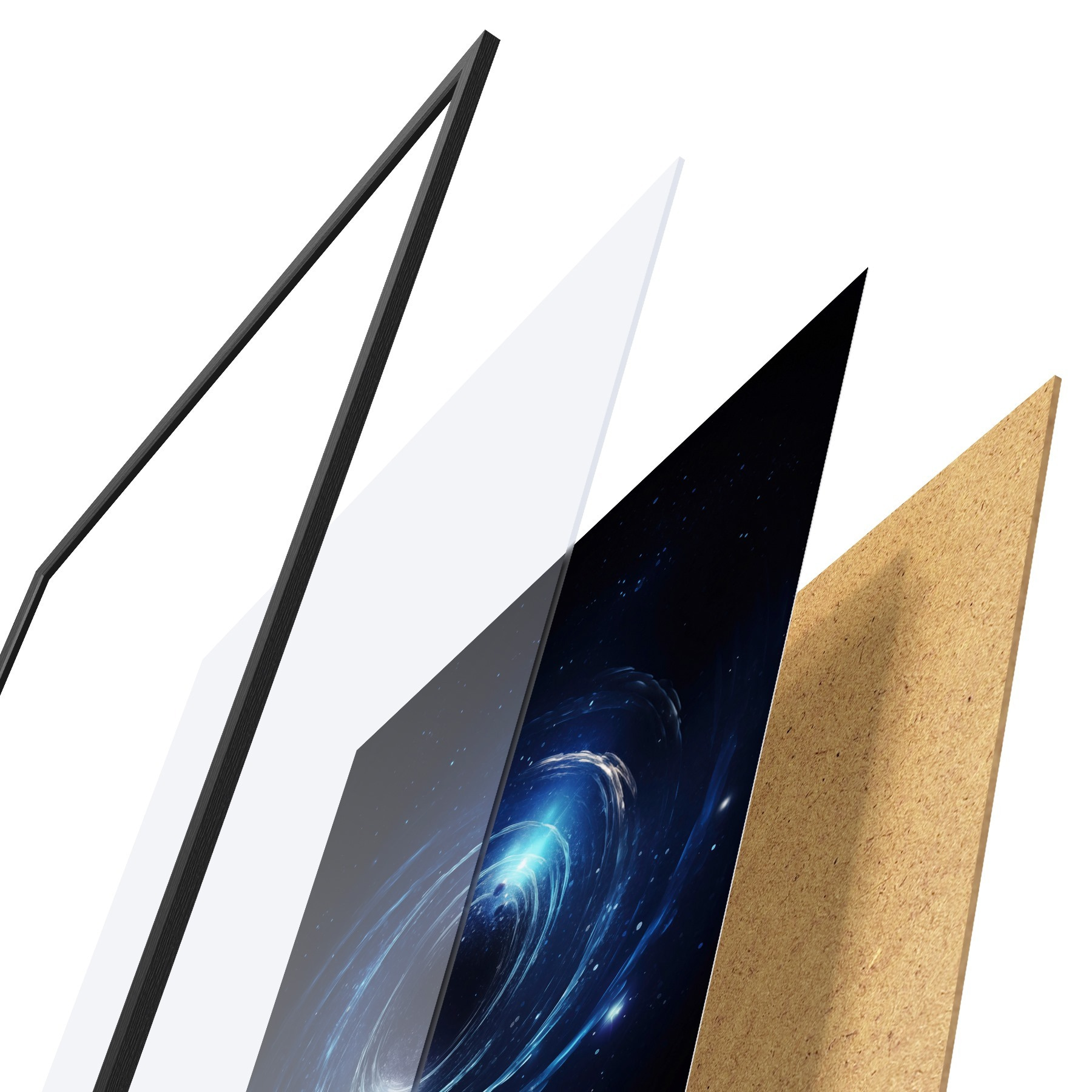 Plakatą sudaro rėmas, pleksiklas, atspausdintas vaizdas ir medžio drožlių plokštės pagrindas. Plakatą galima iš karto pakabinti ant sienos dėl kitoje pusėje esančių laikiklių.