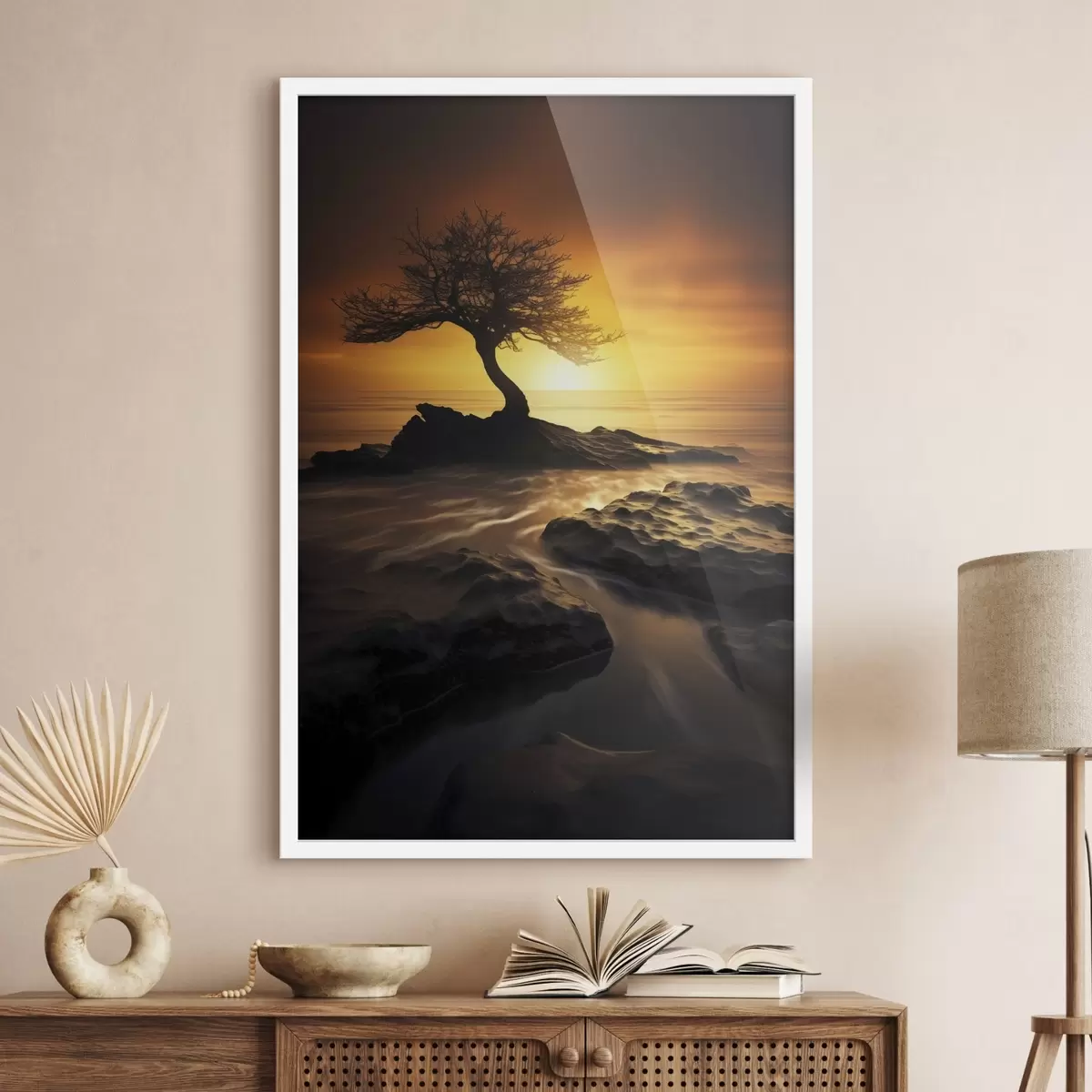 Plakatas Vienišas medis ant uolos saulėlydžio metu f45524