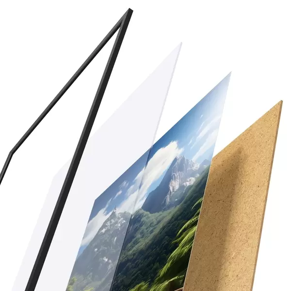 Plakatą sudaro rėmas, pleksiklas, atspausdintas vaizdas ir medžio drožlių plokštės pagrindas. Plakatą galima iš karto pakabinti ant sienos dėl kitoje pusėje esančių laikiklių.