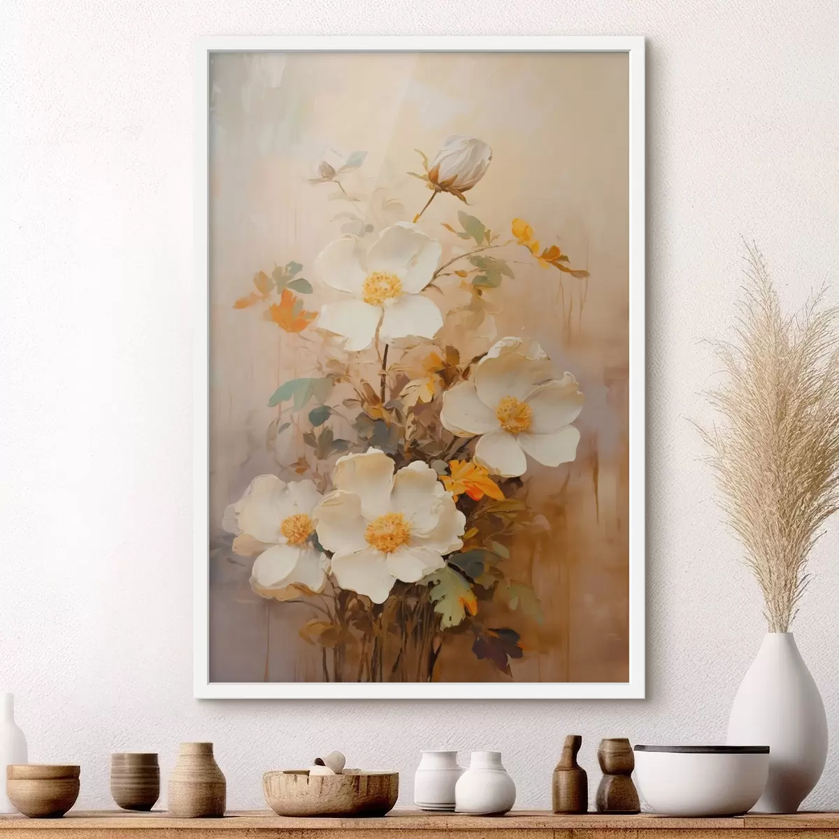 Plakatas Baltos gėlės: tapybiška pastelinių tonų kompozicija f45533