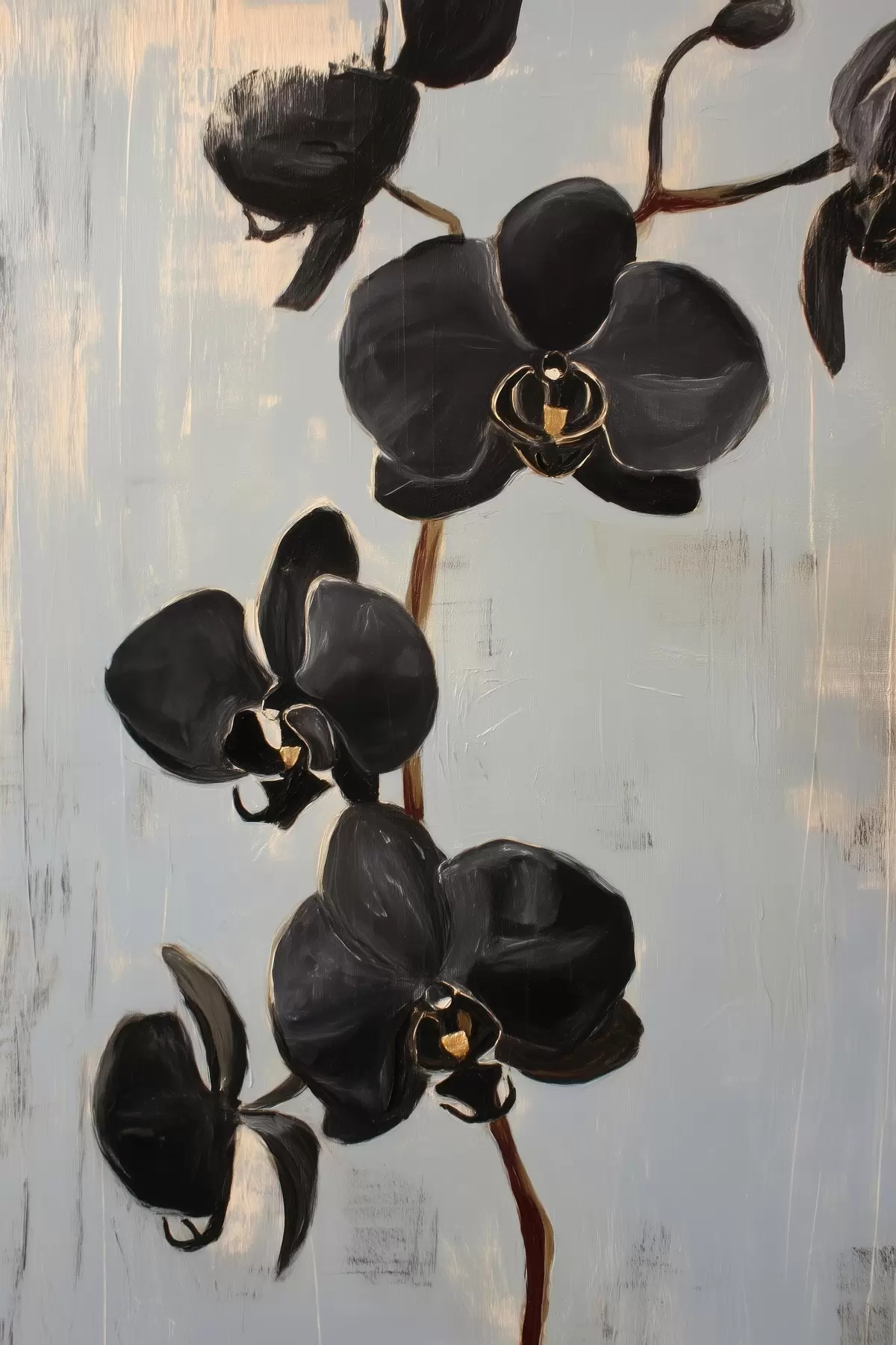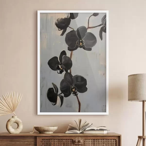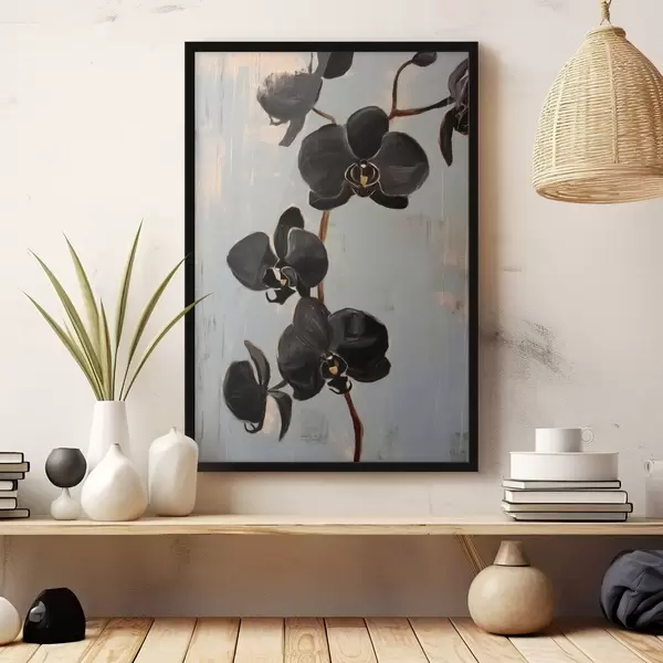 Plakatas Dekoratyvinės orchidėjos: juodos gėlės pilkame fone Ne f45547