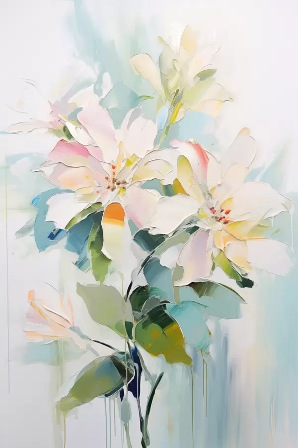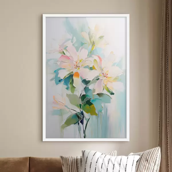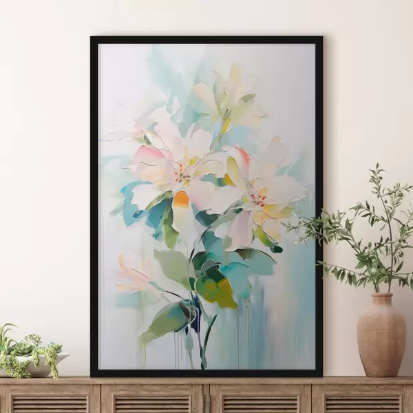 Plakatas Gėlės su spalvotais akcentais, žali lapai, minkšti potėpiai aliejinės tapybos imitacija, šviesiai mėlynas fonas f45549